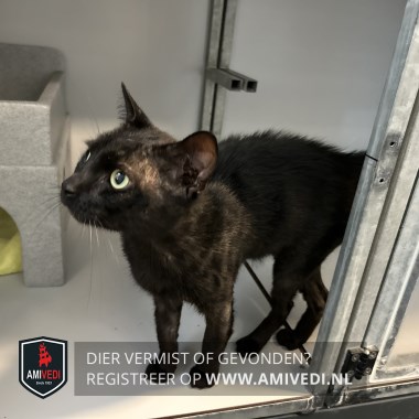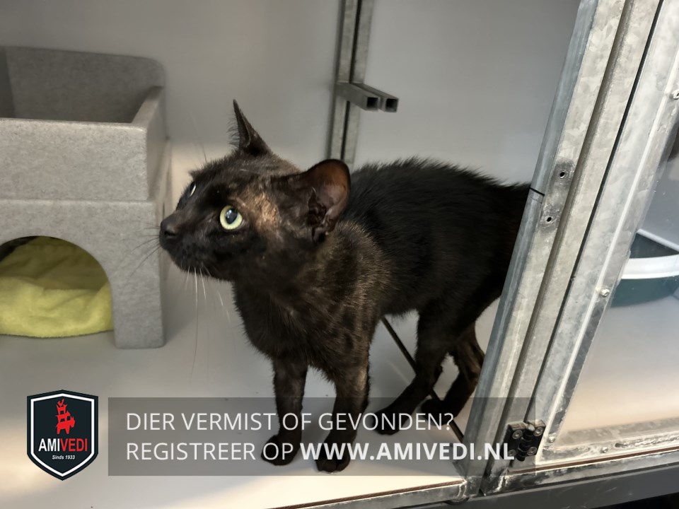 Signalement | Geheel zwarte kat. Zeer slechte vacht met kale en dunne plekken.. |