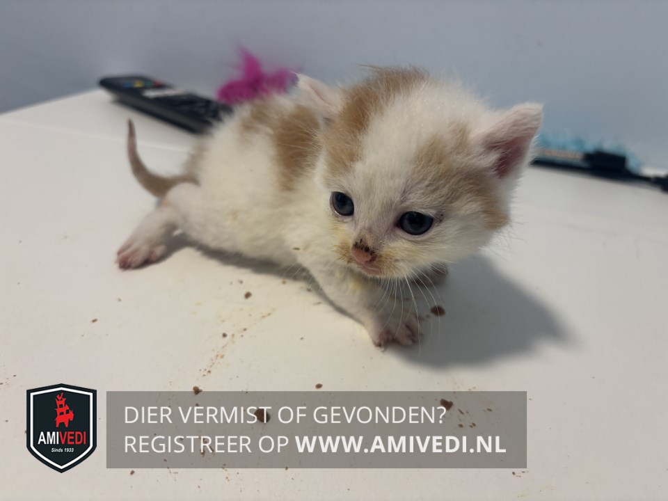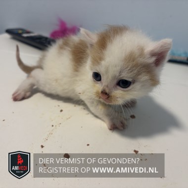 Signalement | Voornamleijk wit kitten met wood om de oortjes, Op de rug een aantal rode vlekken en een rode staart |