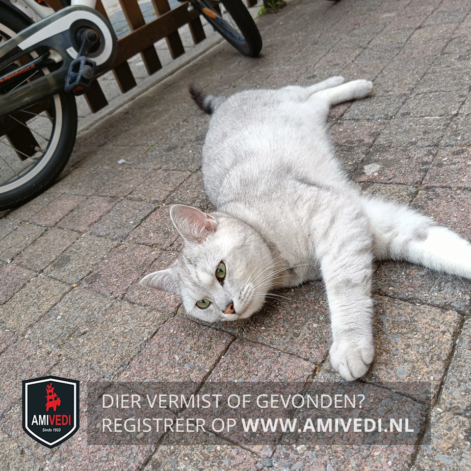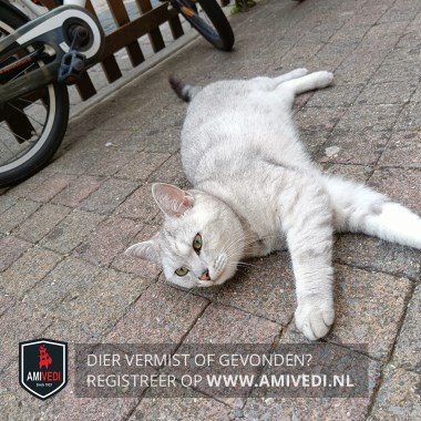 Signalement | Licht grijze jonge kater met een iets donkerdere tekening en een donker staartpuntje. Heeft een donker randje om zijn neus. |