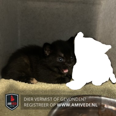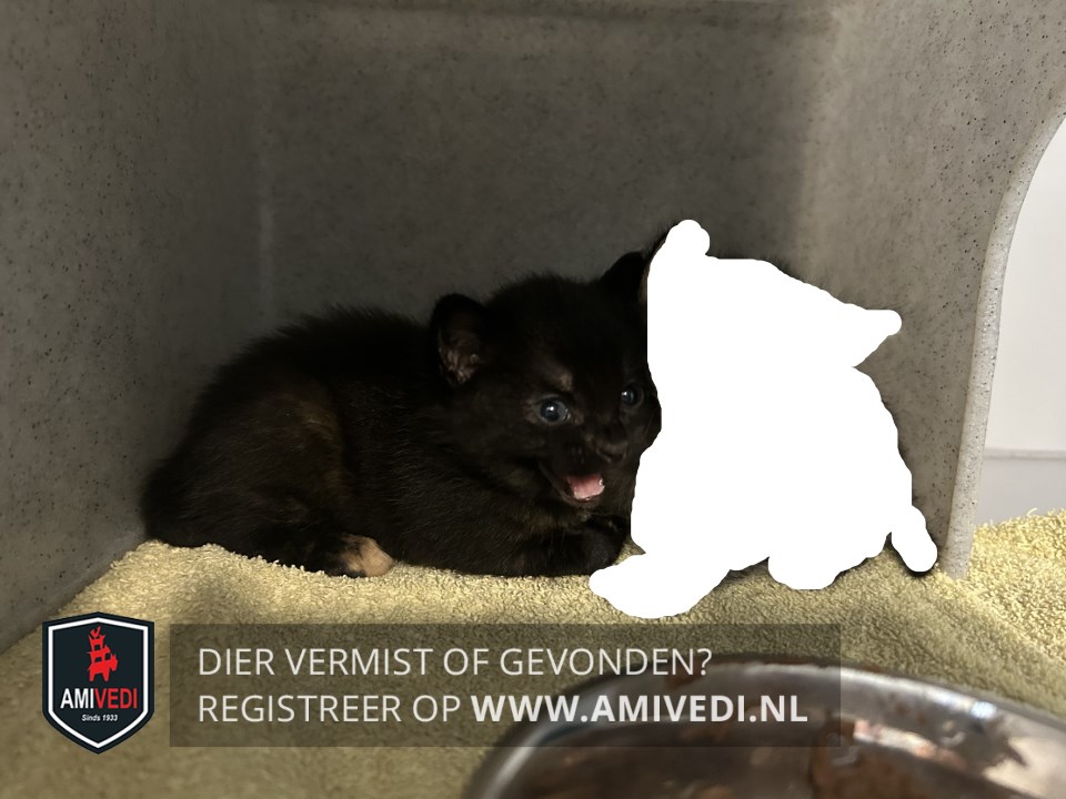 Signalement | Zwart katje met hier en daar op het lijf wat rood. Rechts achter rode teentjes. Zwart neusje. |