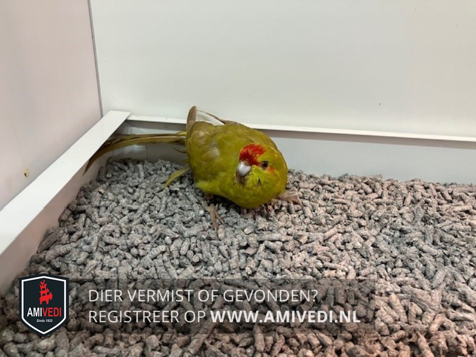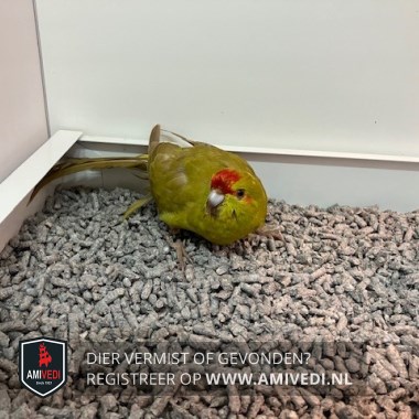 Signalement | Groene Kakariki. Rode vlek boven de snavel. Rode streep die vanaf die vlek naar de ogen toe loopt en na het oog weer verder gaat. Rest van het lijf groen. |