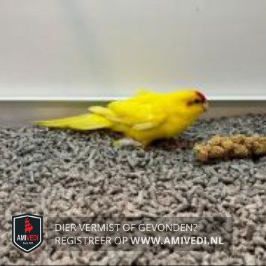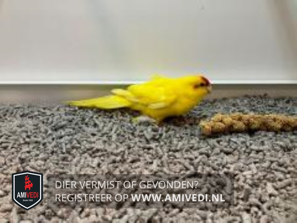 Signalement | Gele kakariki met een rode vlek boven de snavel. Vanaf de vlek loopt een streep naar het oog en na het oog weer verder. Mist zijn linker voetje. |