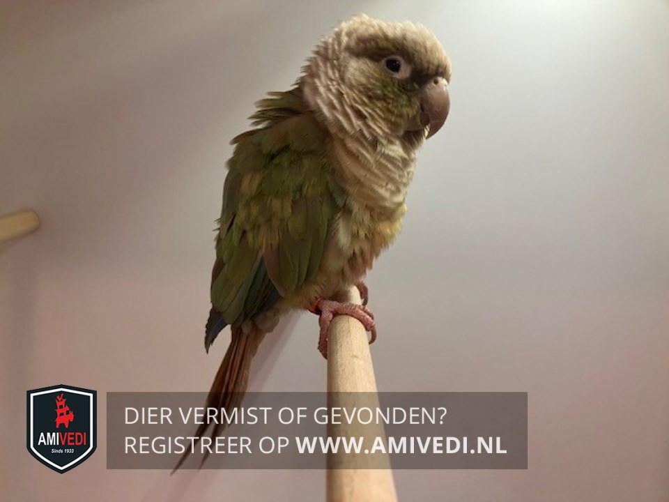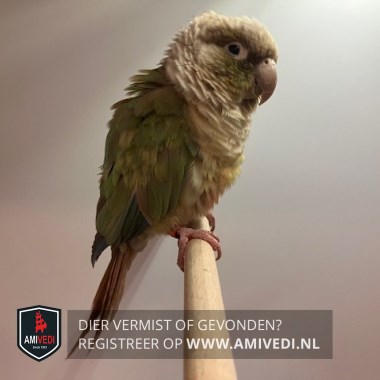 Signalement | pyrrhura met groene vleugels en staartpennen. Verder grijs van kleur. |