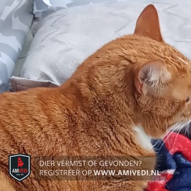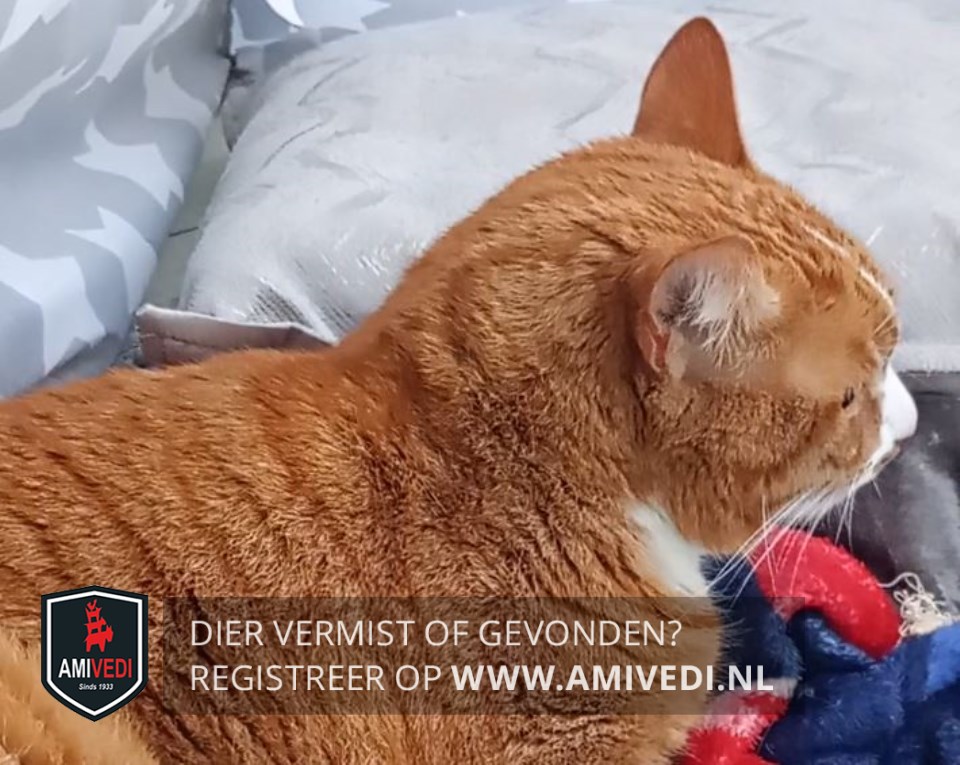 Signalement | Cypers rode kater met wit op de neus en op de snoet, witte snorharen en witte hals. |