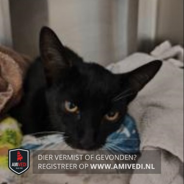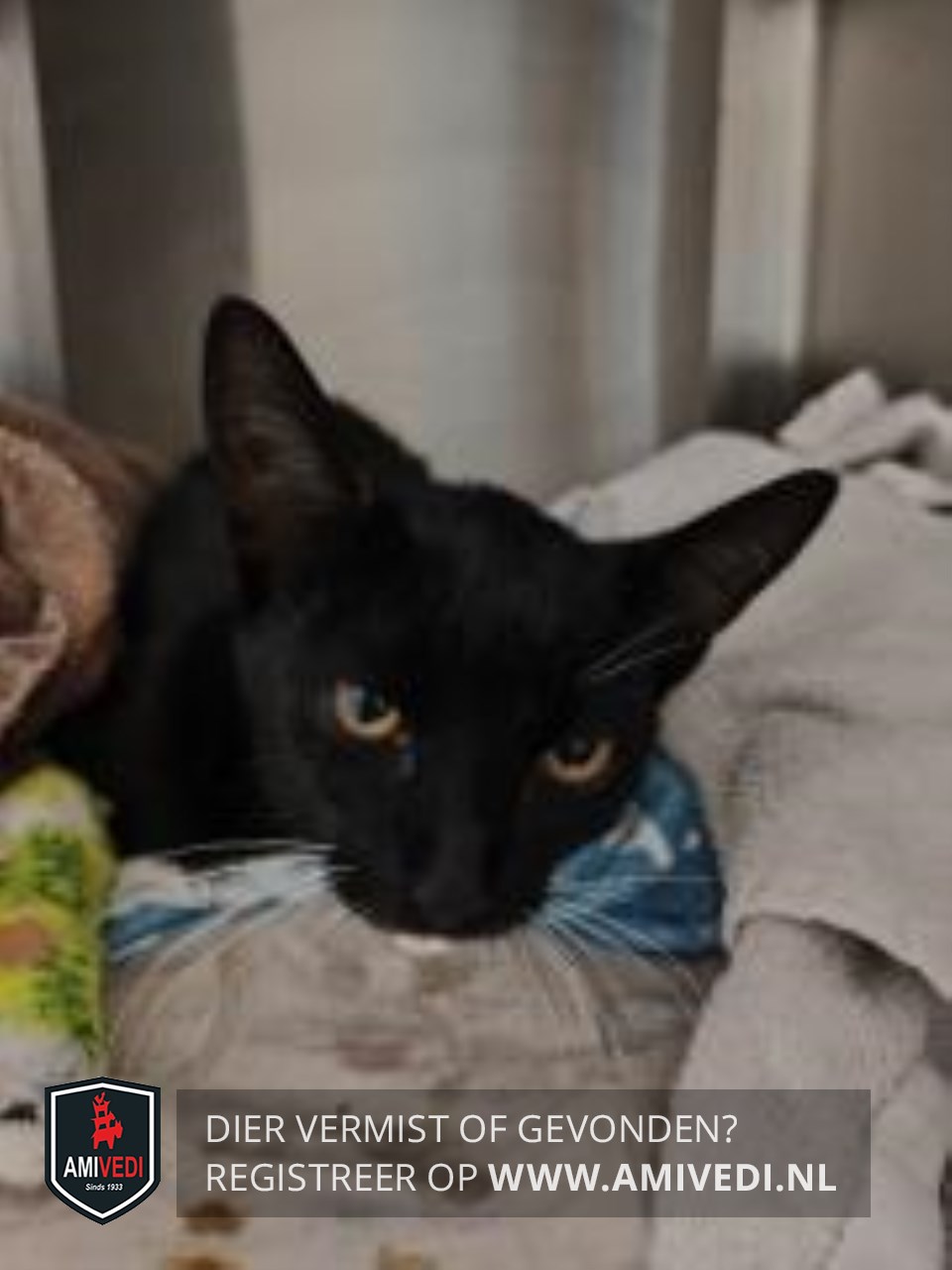 Signalement | Zwart poesje met een wit kinnetje. Heeft witte snorharen, ook witte haren boven het oog alleen rechts boven het oog zijn de lange voelharen zwart. Oranje ogen. |