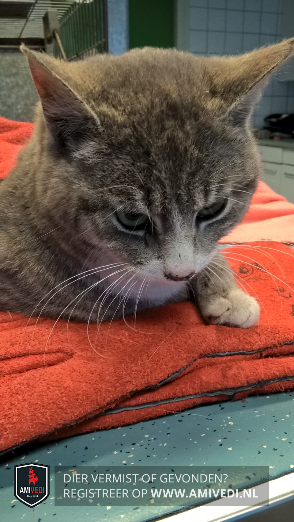 | Signalement | zeer licht gestreepte grijs zwarte kat , witte bef, eitte poten voor , witte snorharen , kleur is erg licht van e vacht |