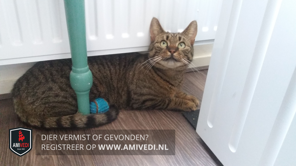 | Signalement | Grote kater. Cypersbruin met bandje. |