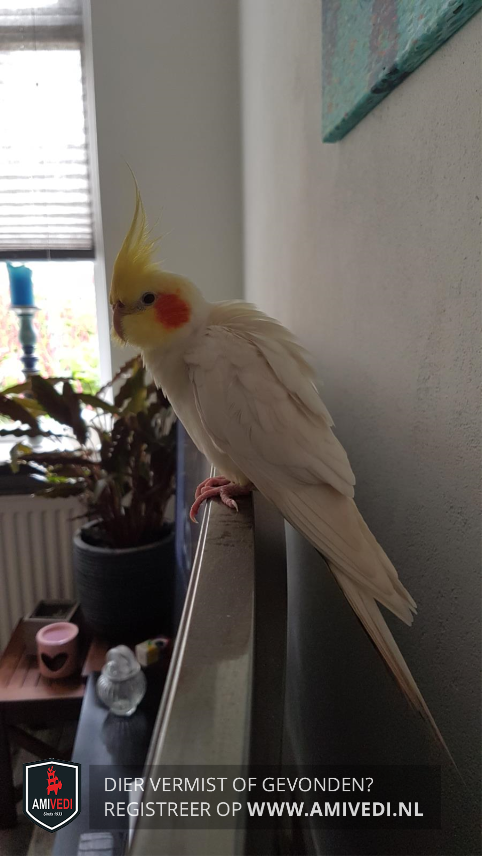 | Signalement | Wit met gele kuif en gele kop met rode wangetjes. |