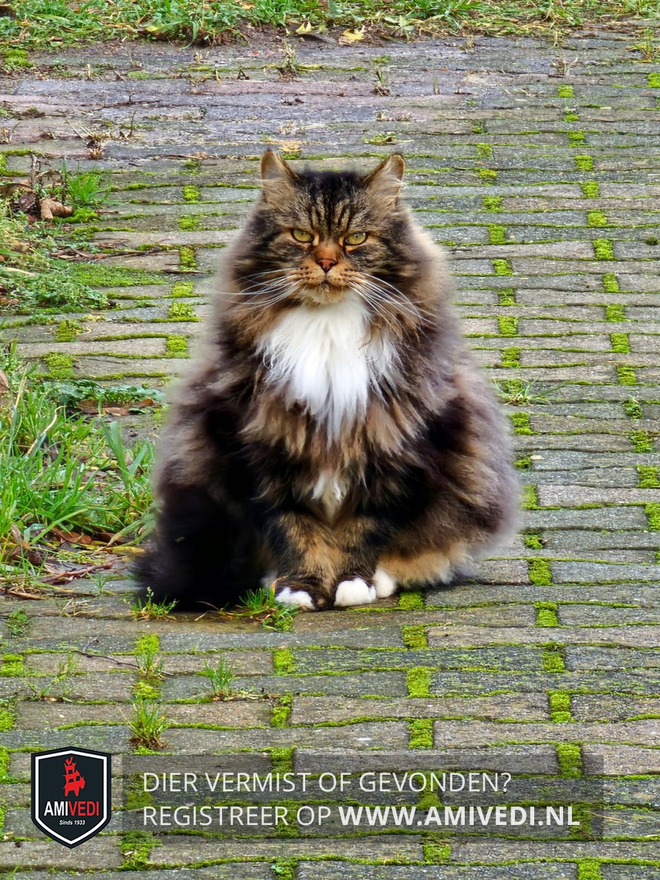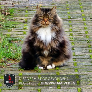 | Signalement | Half langharige zwart met bruin en witte kruising Siberische boskat. Witte bef en voetjes. Hij is schuw naar vreemden. |