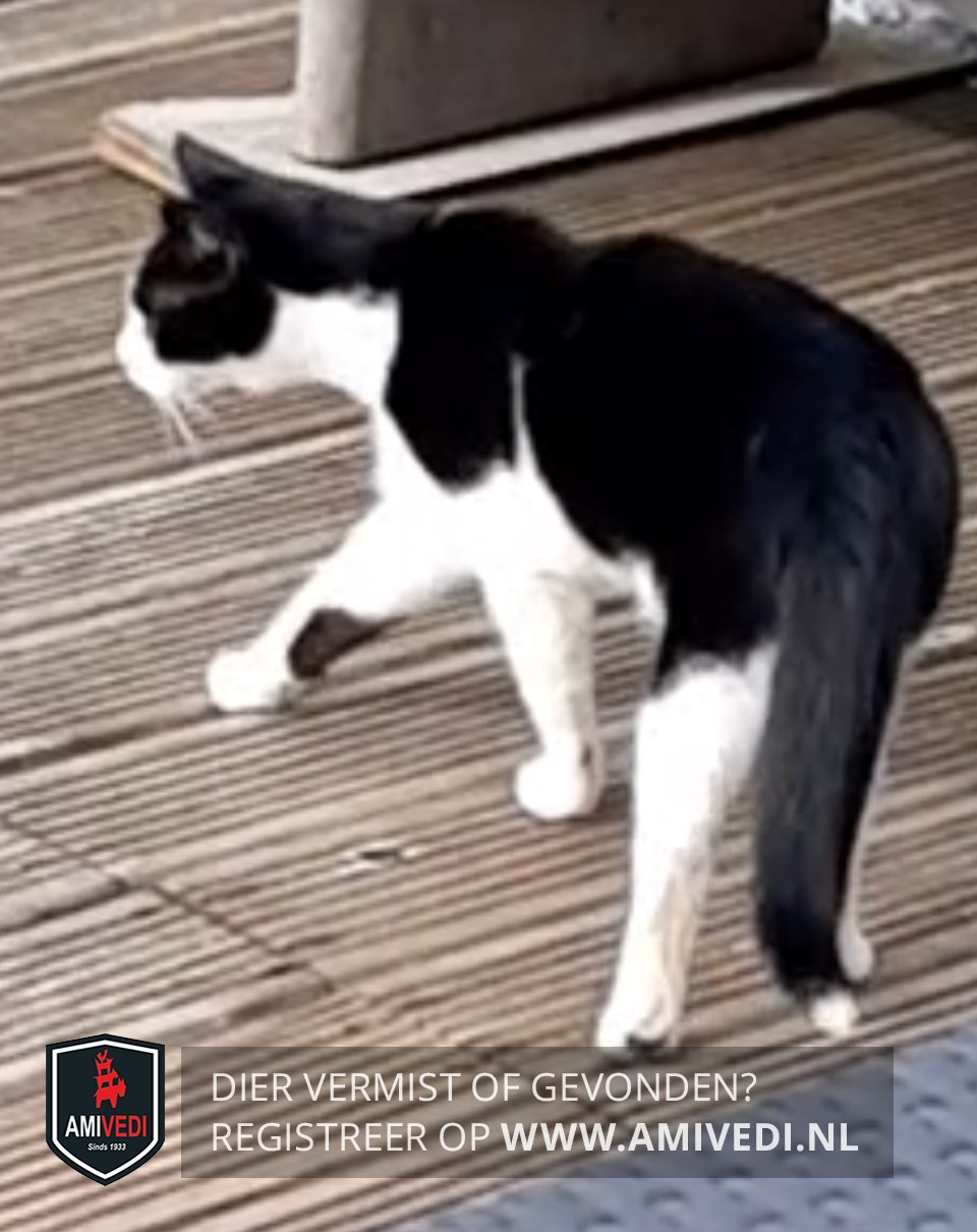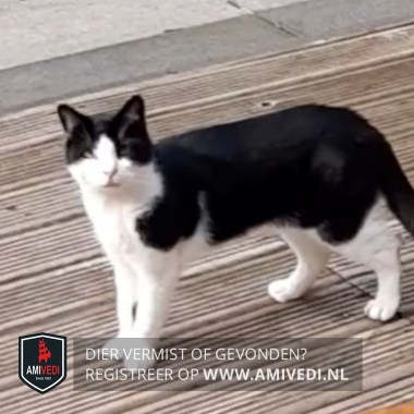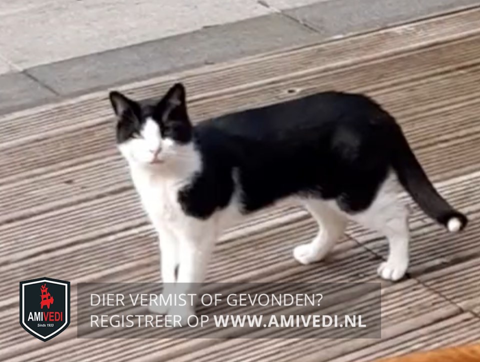 | Signalement | Zwart met witte kater. Zwart masker, aan de linkerzijde tot op de wang,.aan de rechterzijde tot naast het oog, witte neusbrug en snoet. Witte kin en borst. Zwarte rug en flanken, achter de linker voorpoot een witte streep richting rug. Op de rechter voorpoot een zwart vlekje aan de binnenzijde, verder zijn alle poten wit. Zwarte staart met witte punt. Geen halsband. |