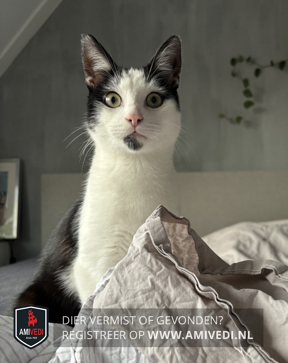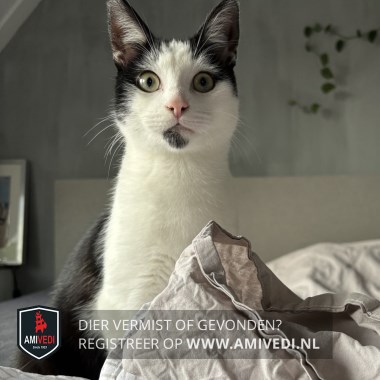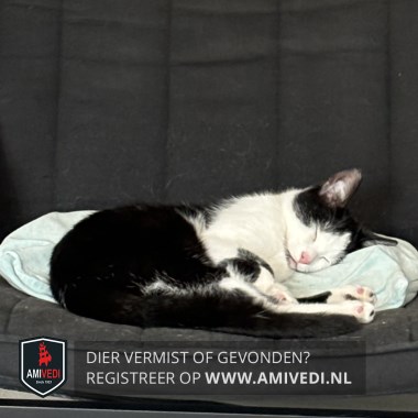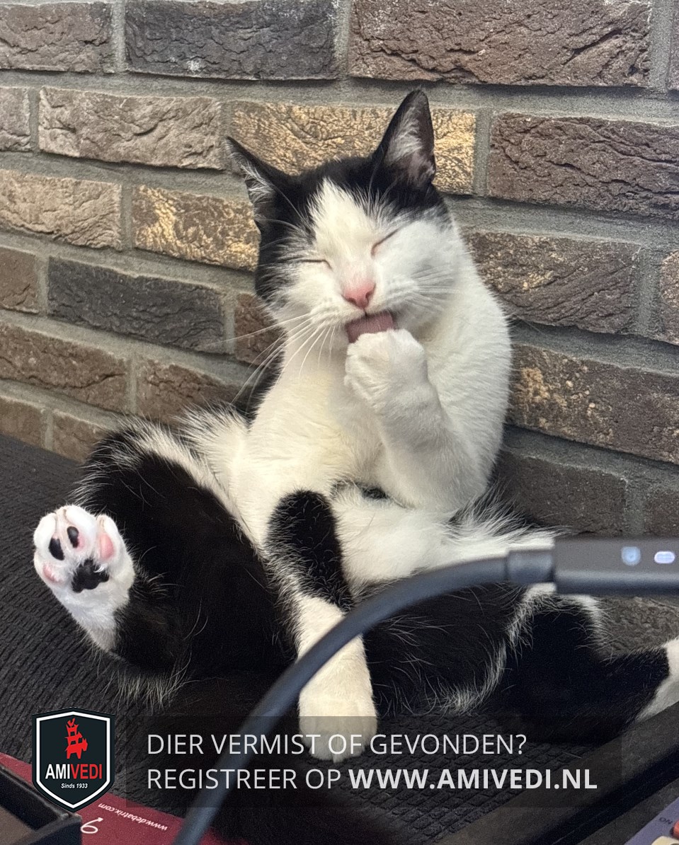 Signalement | Zwart met een wit masker, een zwarte vlek op zijn kin, witte borst, witte kraag. Zwart op het kopje, rug en staart, Voorpoten wit en een wit sokje, achterpootjes een witte poot en een wit sokje. |