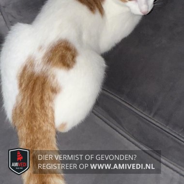Signalement | Overwegend wit met cypers rode gestreepte vlekken. Weerszijde van het kopje langs de buitenrand van de ogen naar de wangen een rode cyperse vlek, op de schouder een rode vlek, op de rechter heup een rode vlek, rode vlek op de binnenzijde hak rechter achterpoot, rode cypers geringde staart. |