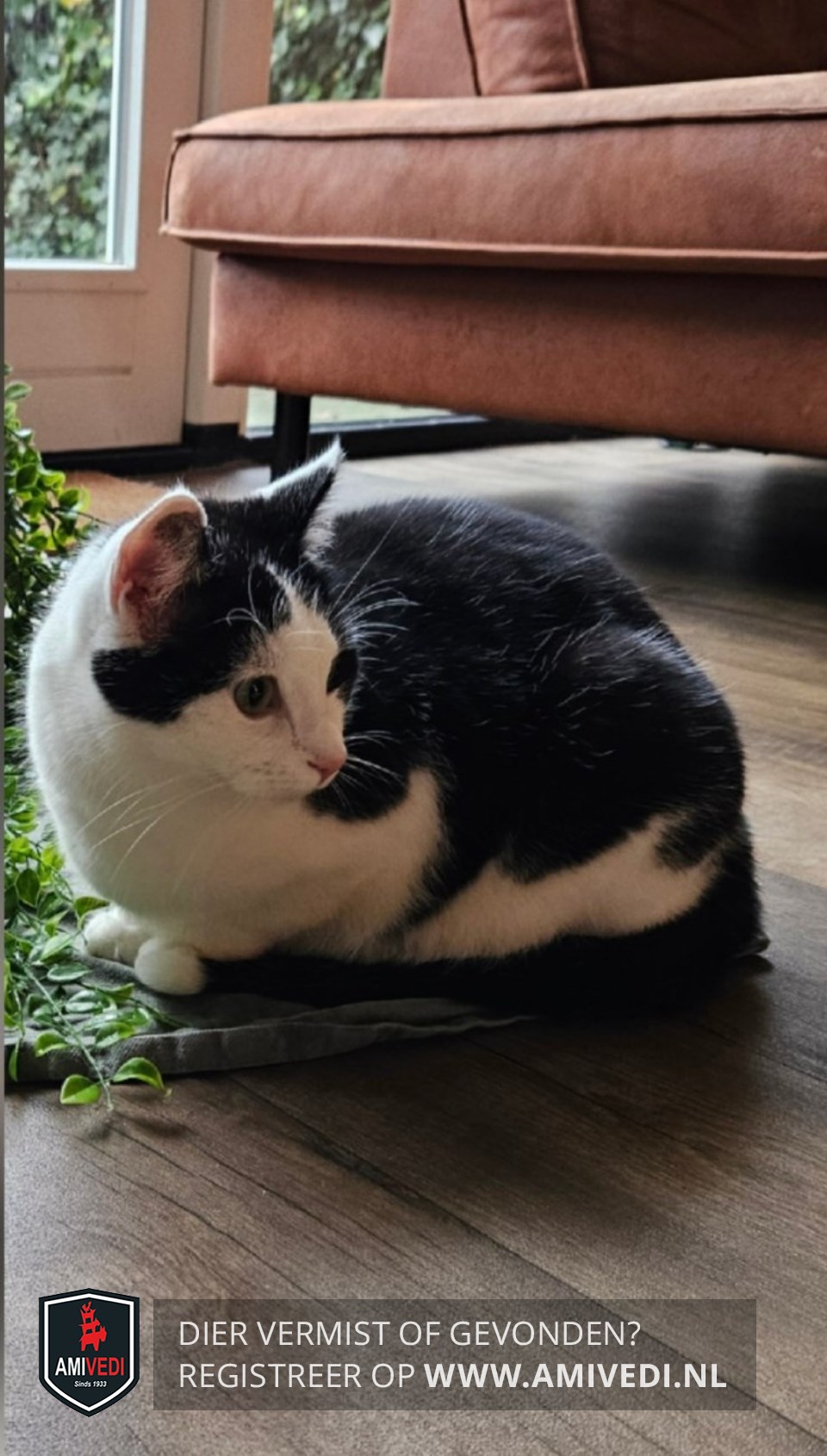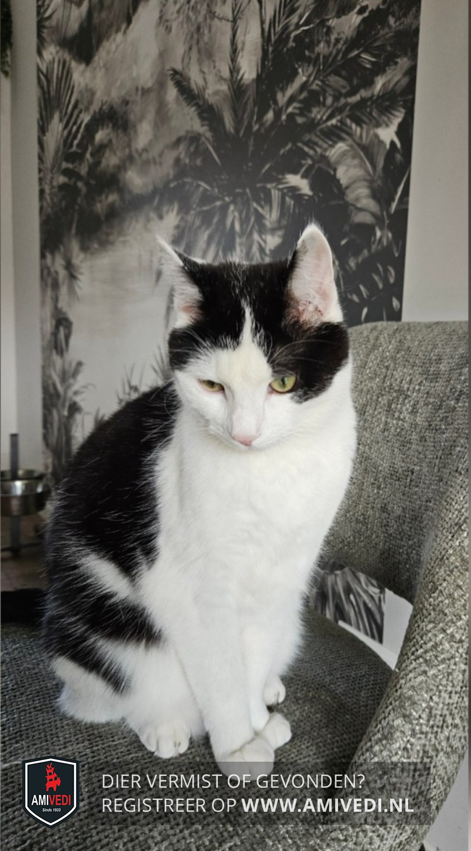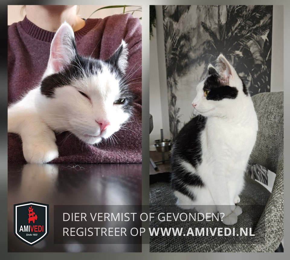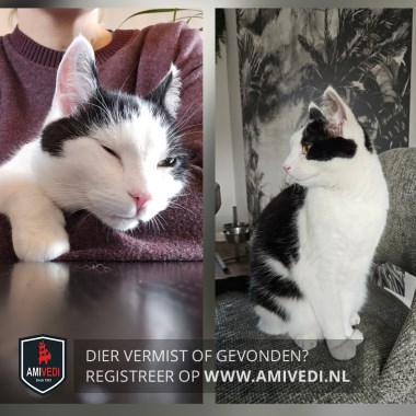 Signalement | Zwart bovenop de kop tot langs het rechteroog en over het linkeroog, rug en flanken grotendeels zwart, staart zwart; rest snoet, nek, hals, borst, buik en poten wit; zwart vlakje op de buik |