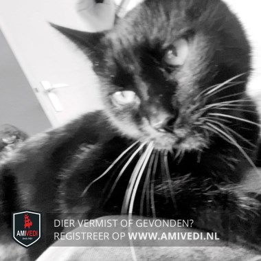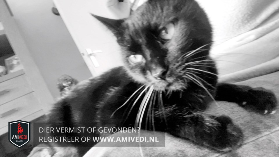 Signalement | Zwart, paar witte haren op de borst. Loopt moeilijk in verband met heupproblemen. |