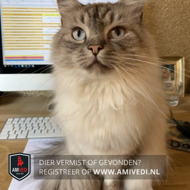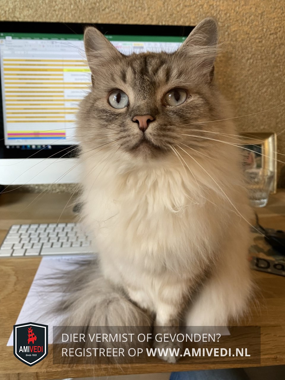Signalement | Een langharige grijs/ witte kat. Snoet is zowel grijs als beige met roze neusspiegel. Grijzige neus. Lange beige snorharen. Tabbytekening voorhoofd. Blauwe ogen. Heeft 3 tanden. Kinnetje zowel wit als grijs. Lijf is vooral wit/beige. Onderste deel van poten is grijzig evenals de staart. Kent omgeving niet. |