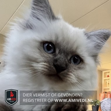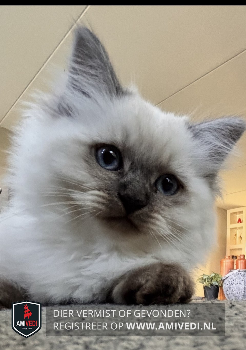 Signalement | Ragdoll-kitten met donker in de snoet, oren, pootjes en staart, verder beige van tint |