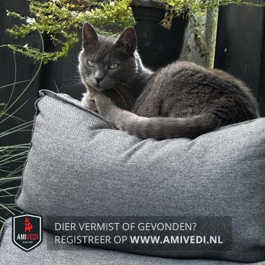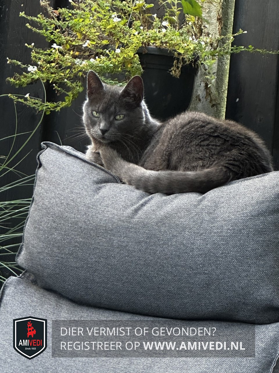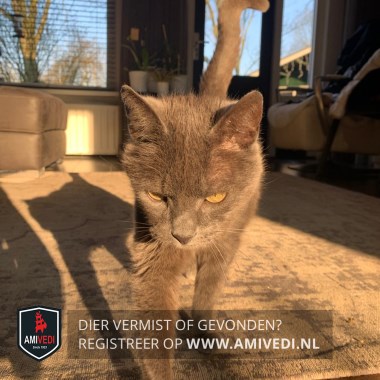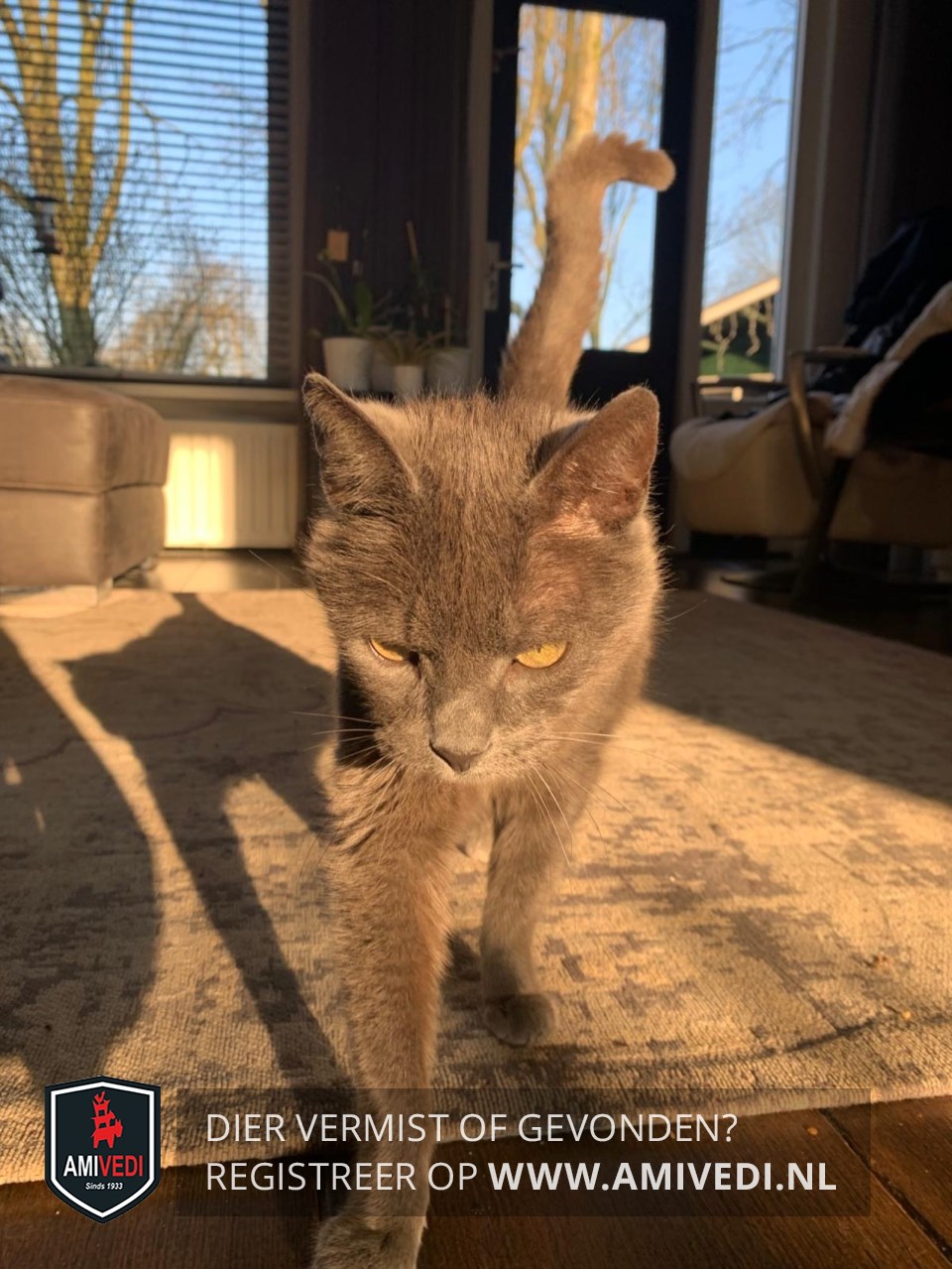 Signalement | Geheel grijze poes met geel/groene ogen. Ze heeft diabetes en heeft elke dag medicijnen nodig. |