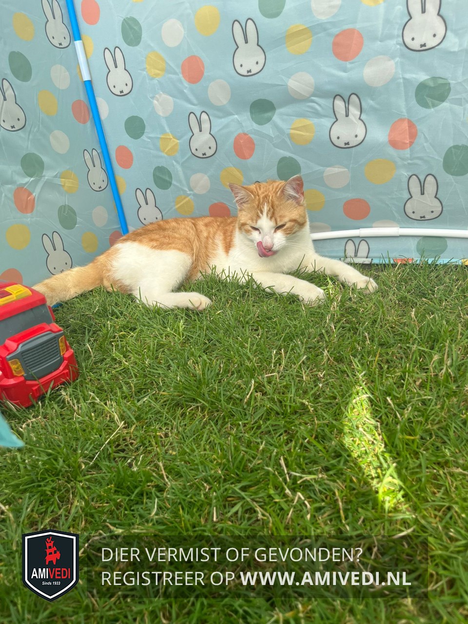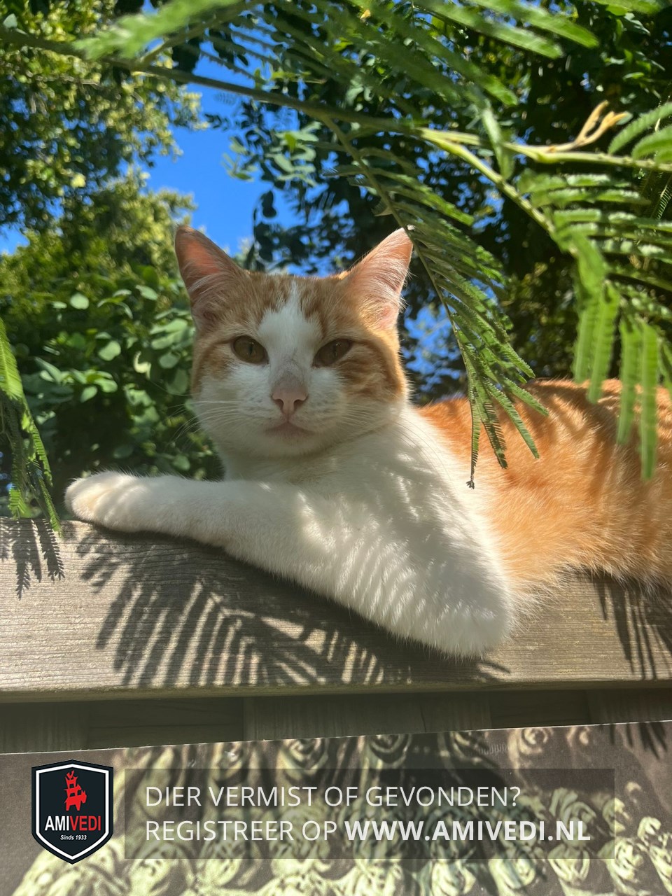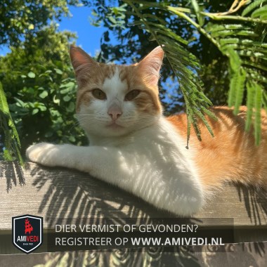 Signalement | Cypers rood met wit, rode oren en kopje met witte bles en snuit, witte kin loopt door tot onderaan de voorpoten, witte buik, cypers rode rug, rechts witte achterpoot, cypers rode staart. |