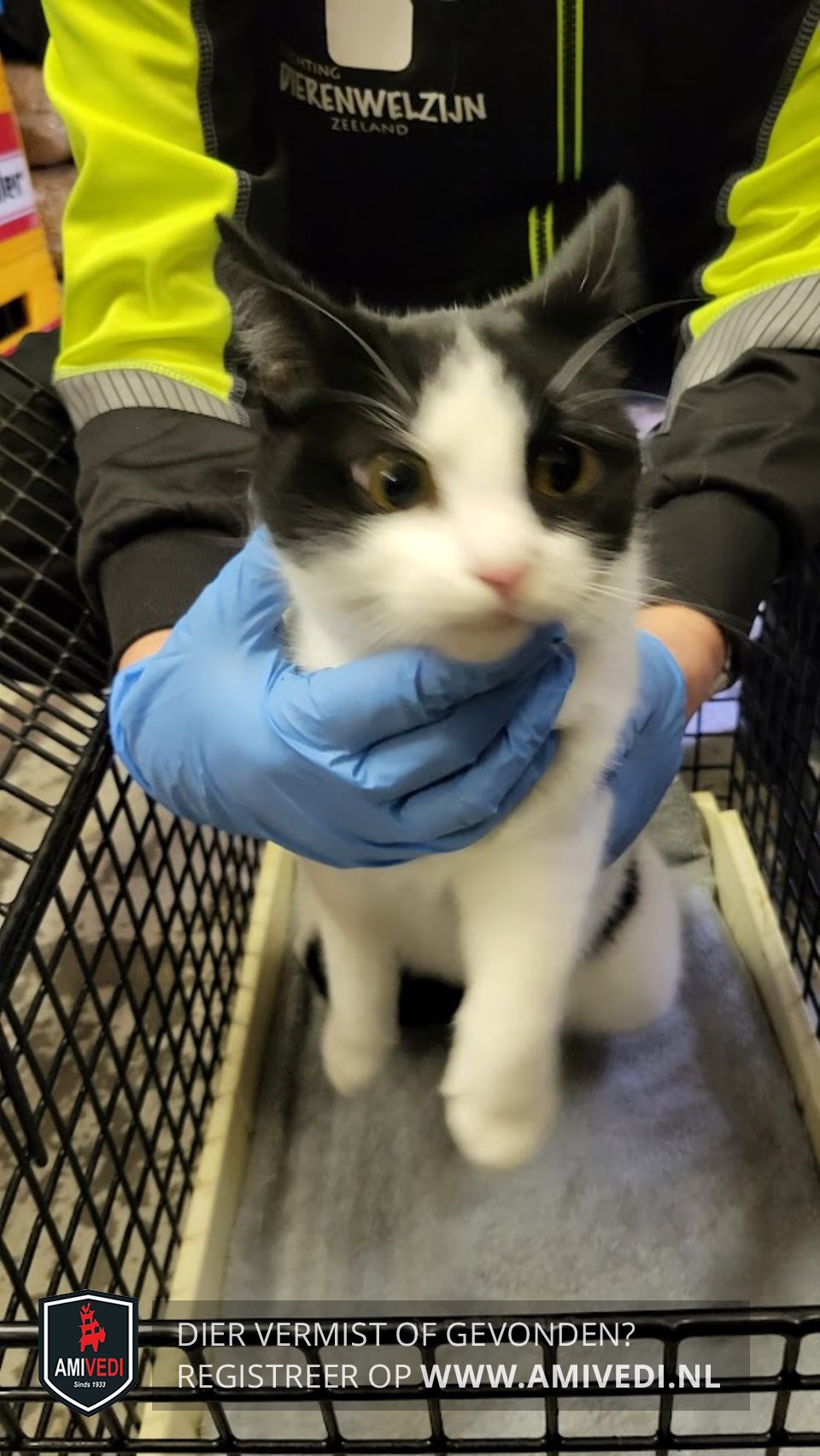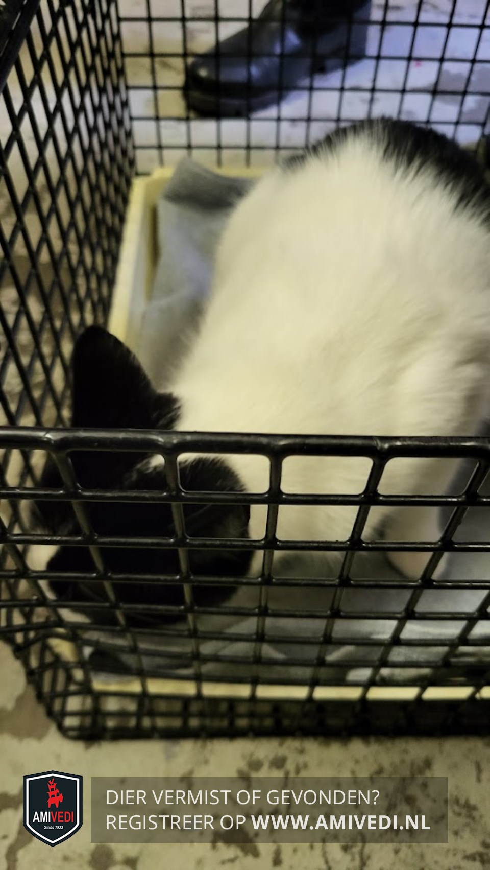 Signalement | Wit/zwarte poes. Witte snoet, bles, bef en borst. Witte voorpoten. Zwart rondom de oren tot over de ogen. Meest witte rug die in een punt uit loopt tussen de oren. Zwarte vlek op einde van de witte rug die naar de linker flank loopt. Zwarte staart. |
