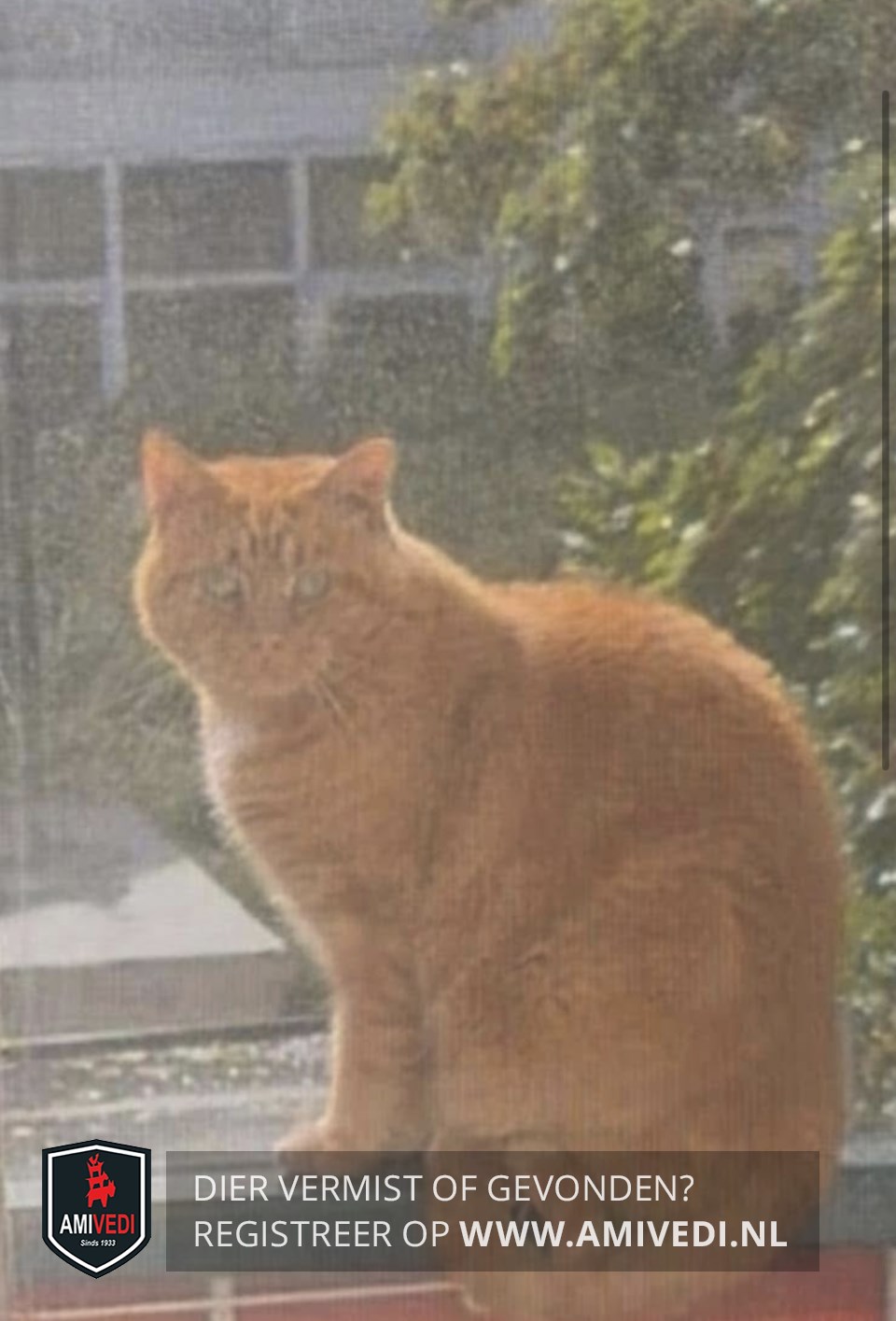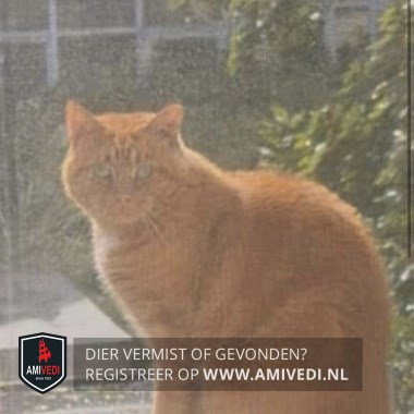 Signalement | Grote rode kater egaal maar deels ook gestreept ( poten en staart) Witte bef bij hals |