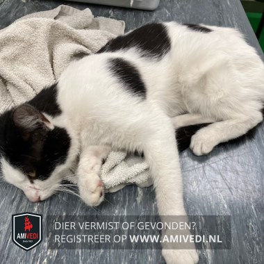 Signalement | Europese korthaar poes, wit met zwart. Bovenkant kopje zwart, zwart loopt door naar linker oog en wang, grote zwarte vlek op schouder aan linkerkant, over de rug 2 grote zwarte vlekken. Poes is aangereden! Dringend op zoek naar eigenaar! |