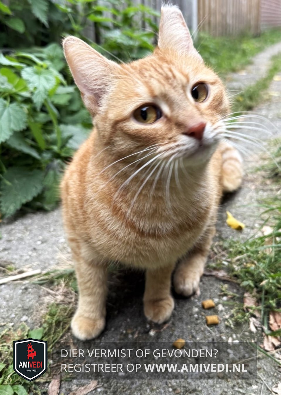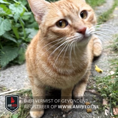 Signalement | Cypers rood gestreept met wit. Voornamelijk cypers rood, roze neusje, onder het neusje een beetje wit, kin wit. Hapje uit rechteroor. Zichtmelding! |