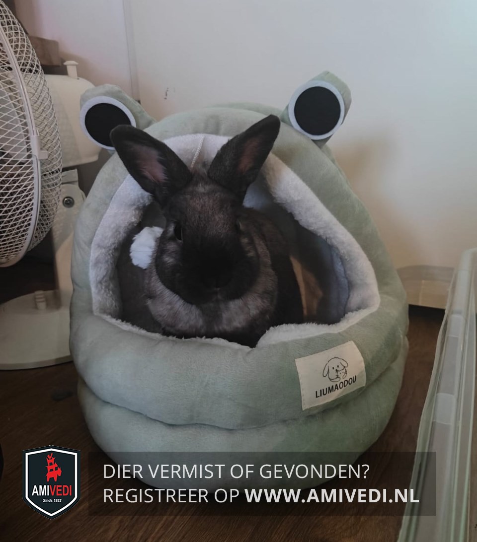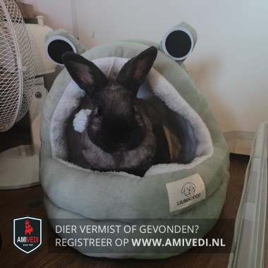 Signalement | Voornamelijk zwart/bruin konijntje. Zwart/bruine oortjes en snuitje. Grijze sjaal om de hals. |