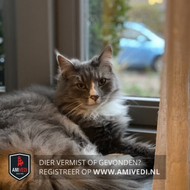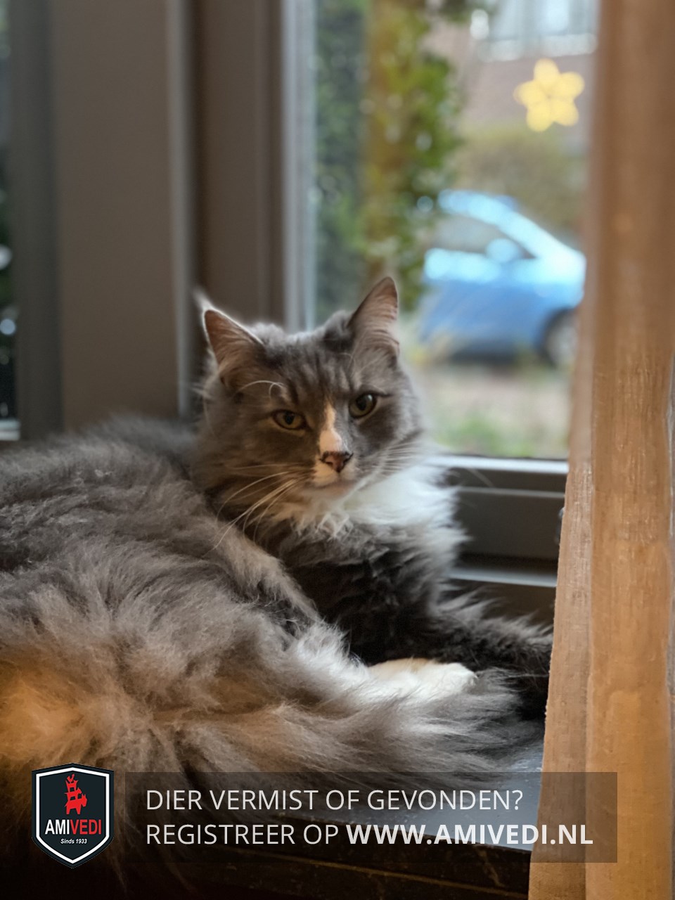 Signalement | Noorse Boskat, blue tabby/ schildpad kleur grijs met rood gemêleerd, een witte streep over haar neus, een witte bef, buik en wit aan de pootjes. |