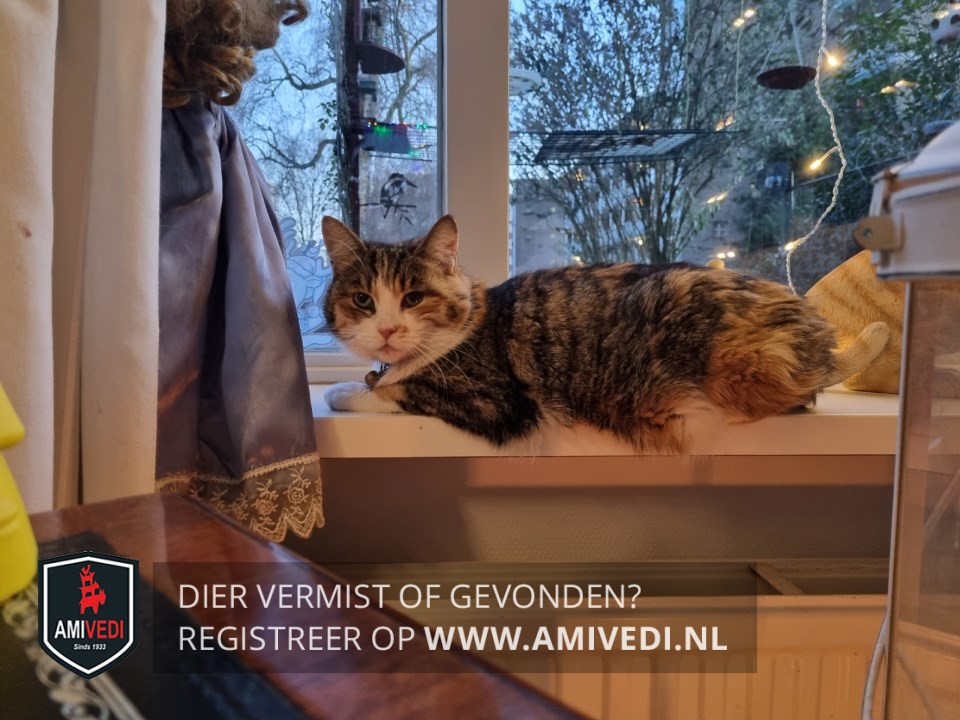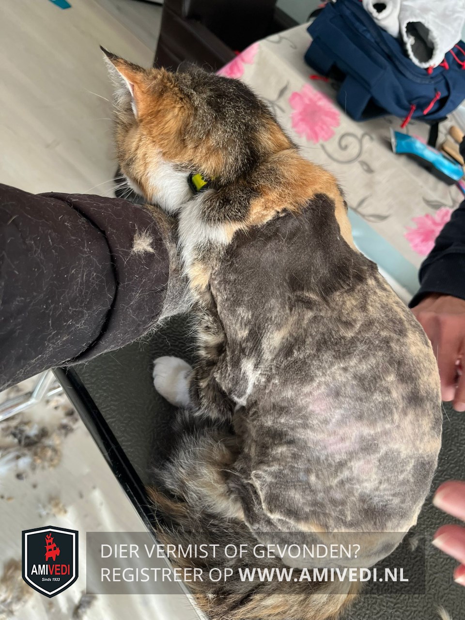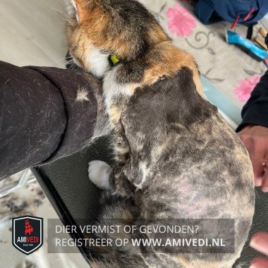 Signalement | Cypers grijs met rood en witte snoet met bles, rood vlekje links naast de neusspiegel, witte kin en bef, lijf cypers grijs met cypers rode vlekken, voor witte sokjes, achter niet zichtbaar op de foto's. 30-9-25 geschoren lijf behalve kop en staart. |