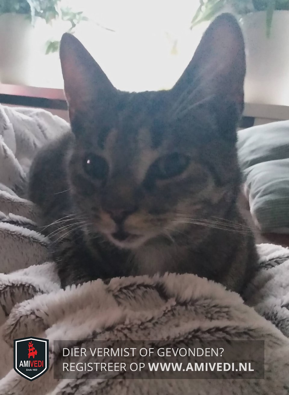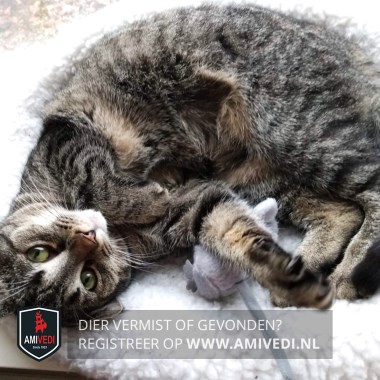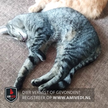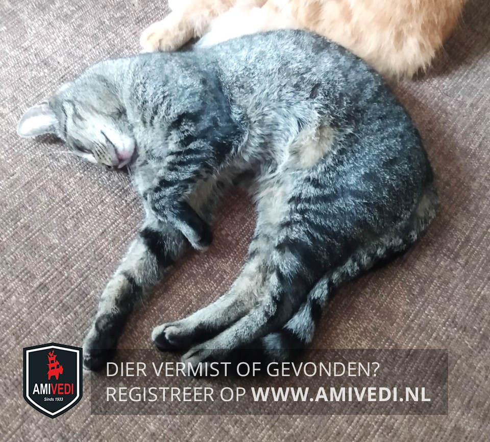 Signalement | Cypers grijszwart gestreept met wit. Voornamelijk cypers grijszwart gestreept, beetje bruin op de neus, roze neusje, onder het neusje een beetje wit, kin en onder de kin wit op de hals een klein befje, zwart onder de voeten, op sommige plekken op lijf en buik wat bruine tinten, staart cypers geringd, staartpunt zwart. Niet zo heel groot, is slank. |