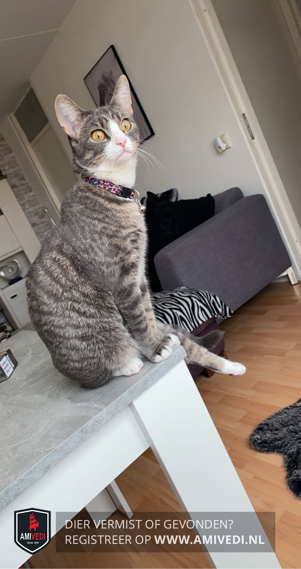 Signalement | Grijs/ beige gestreept met wit. Wit snuitje, kin, hals, bef en witte voetjes. Beige buik. |
