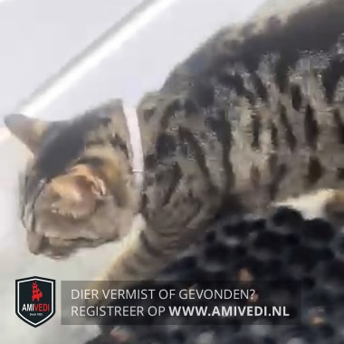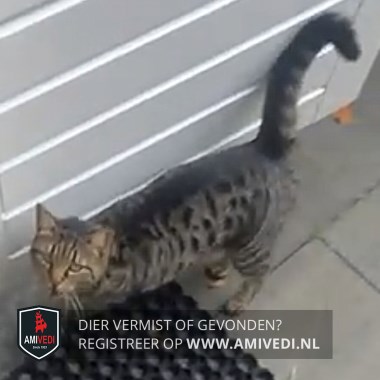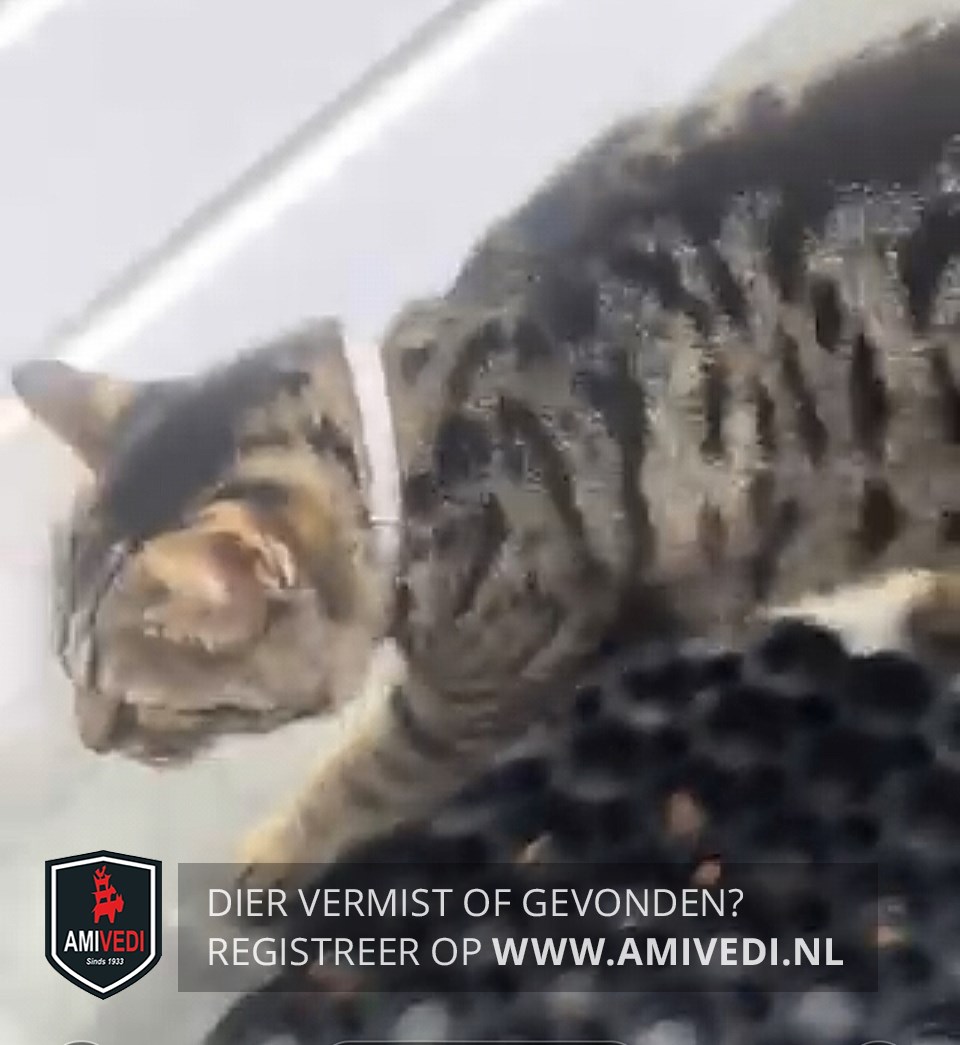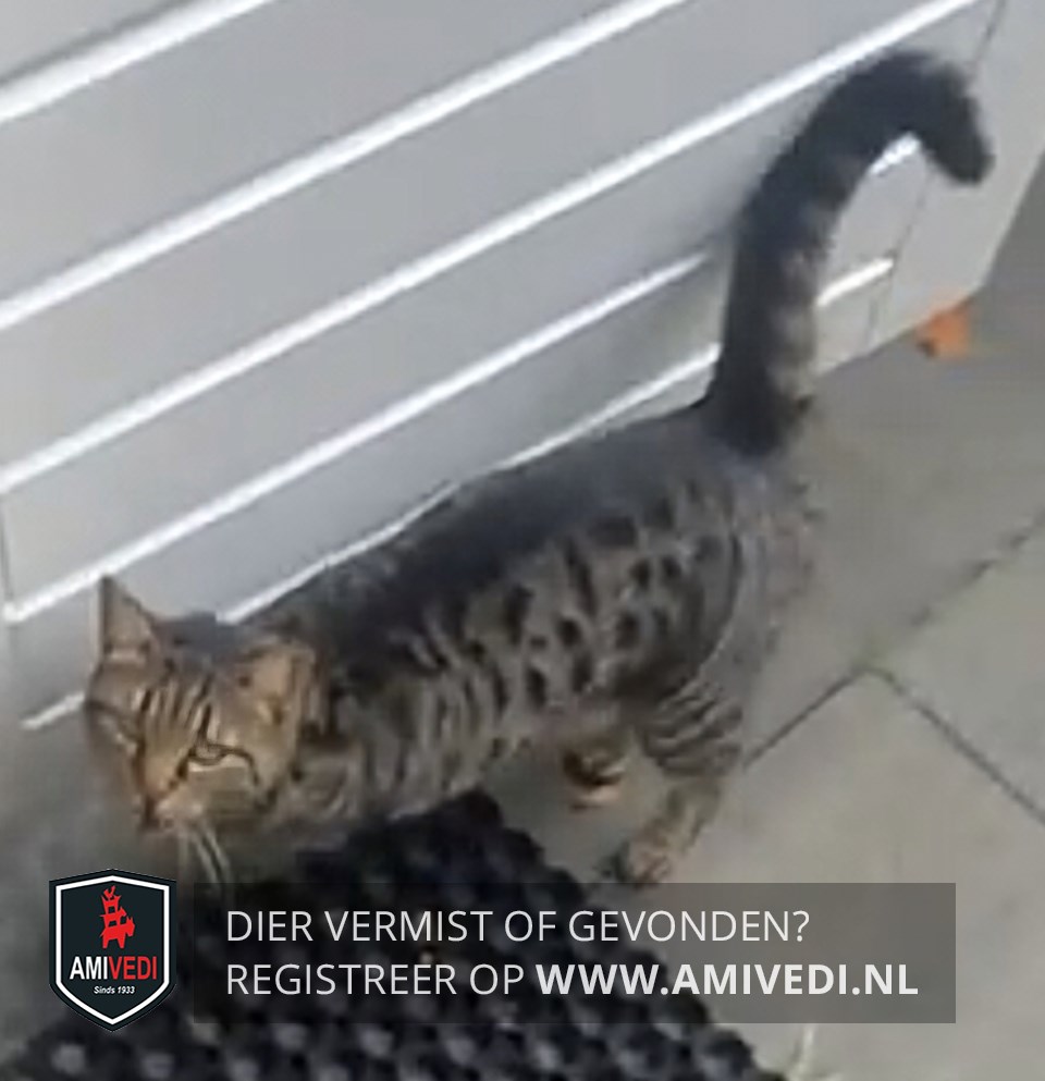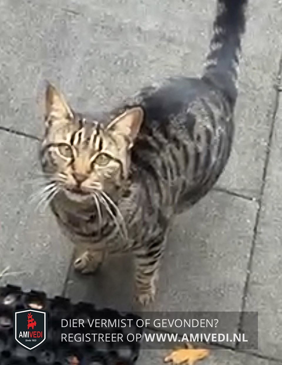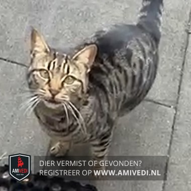 Signalement | Geheel cypers bruin-zwart gestreepte kat. Grijs/ lila bandje met paarse gesp. De kat miauwt heel erg veel. Kent of bent u de eigenaar? |