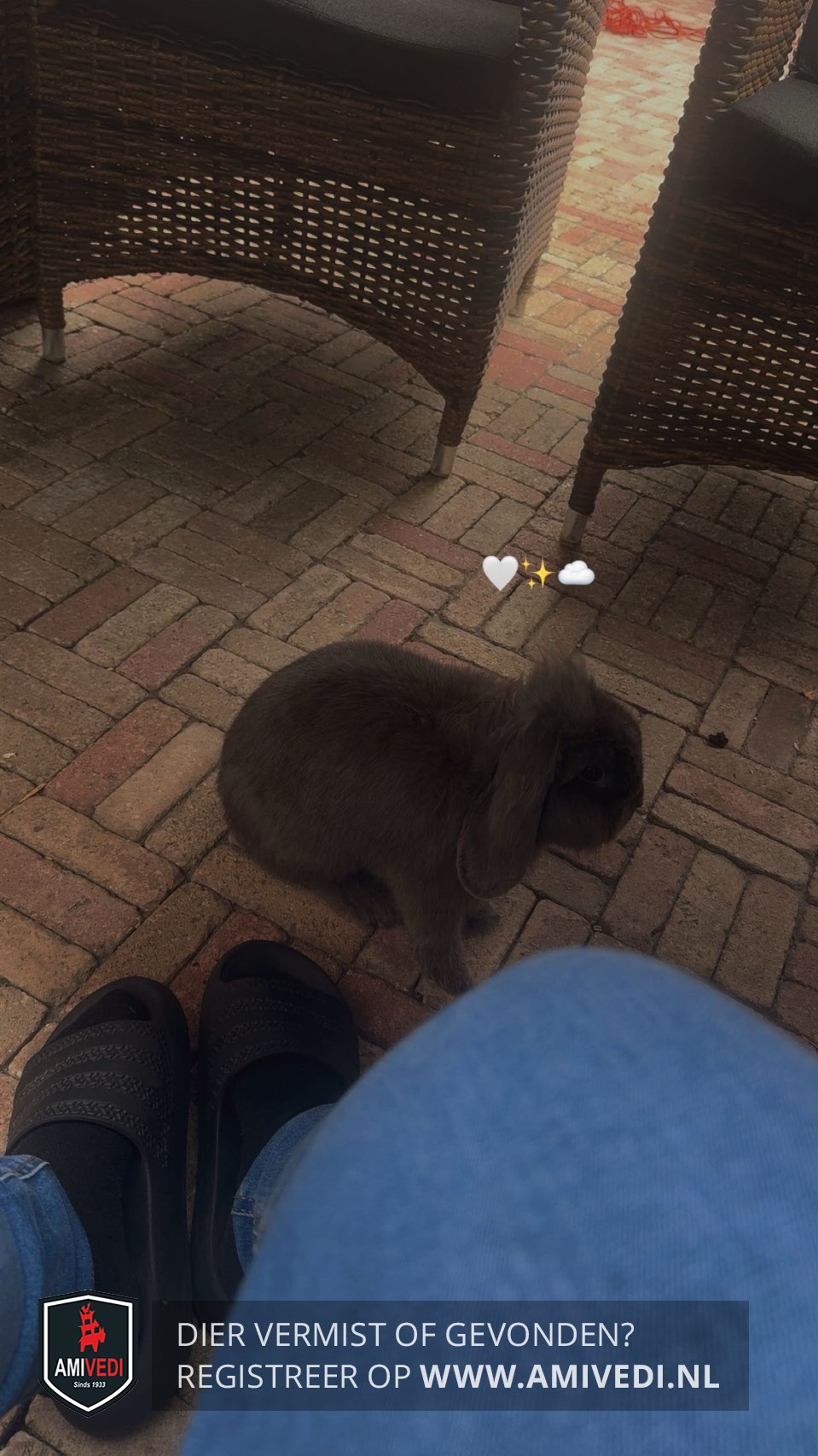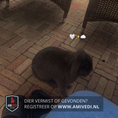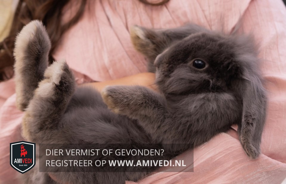Signalement | Grijs hangoor konijn. Hoofdzakelijk grijs met wat lichte vacht onder de voor en achterpoten. |