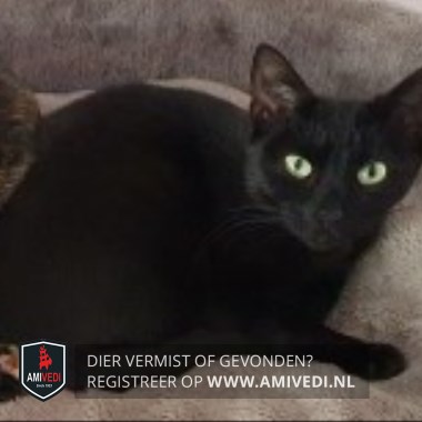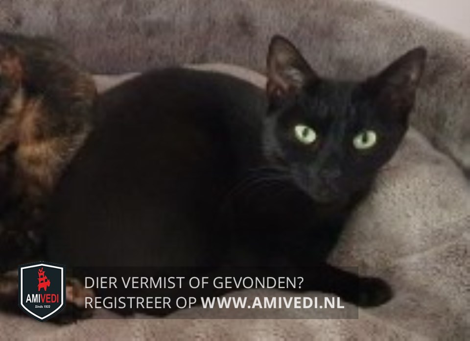 Signalement | Helemaal zwart, klein, felgroen/gele ogen |