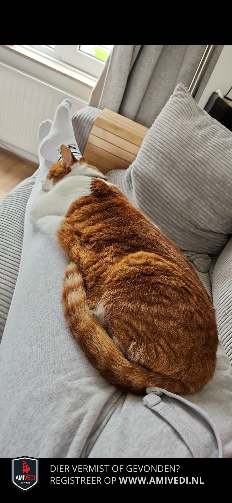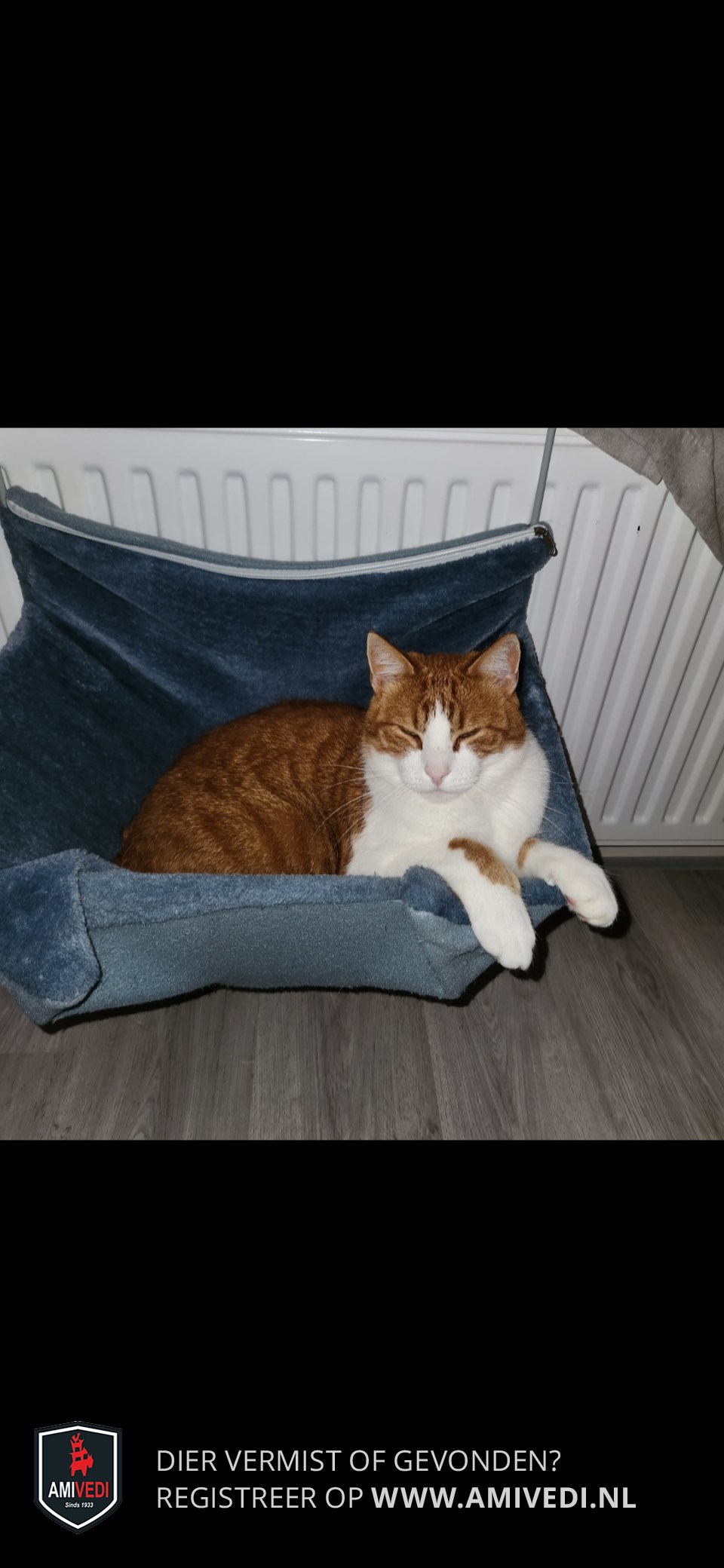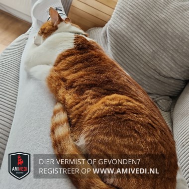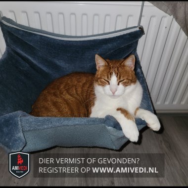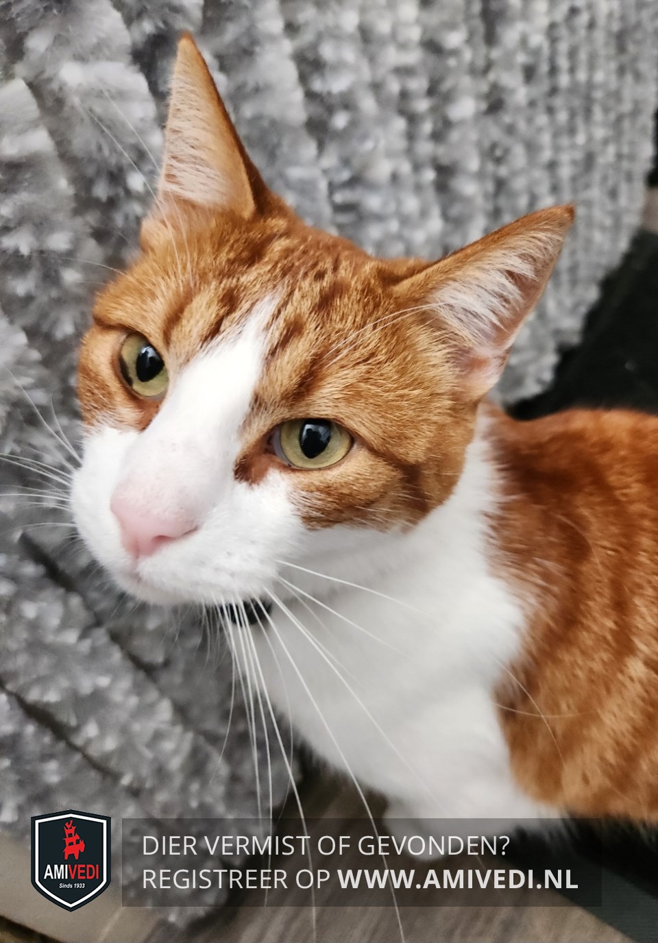 Signalement | Cypers rood met wit. Witte bles, snoet, kin, bef, borst, buik en poten. Op de rechtervoorpoot zit een cyperse vlek. Nier problemen, heeft speciale voeding en medicijnen nodig. Bij zijn rechteroog zitten donkere vlekken in het oog. |