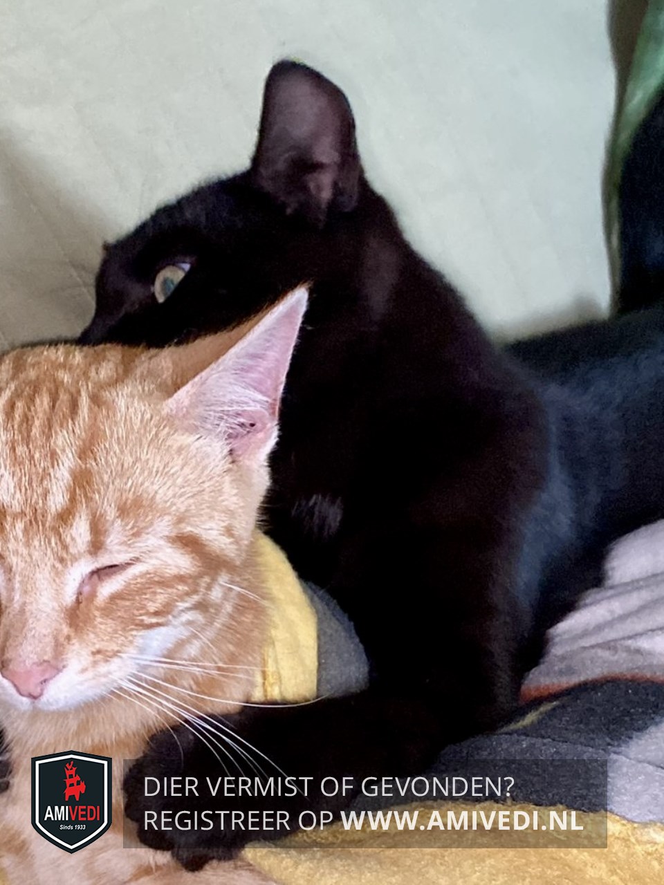 Signalement | Vrij grote zwarte kater met enkele witte haren op zijn borst. Lange staart. Zal zich niet vlug laten zien. |