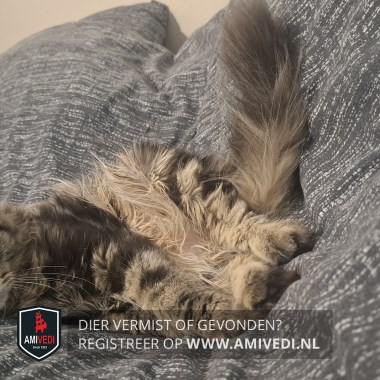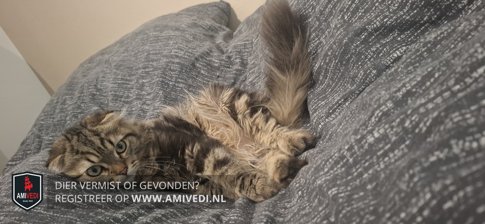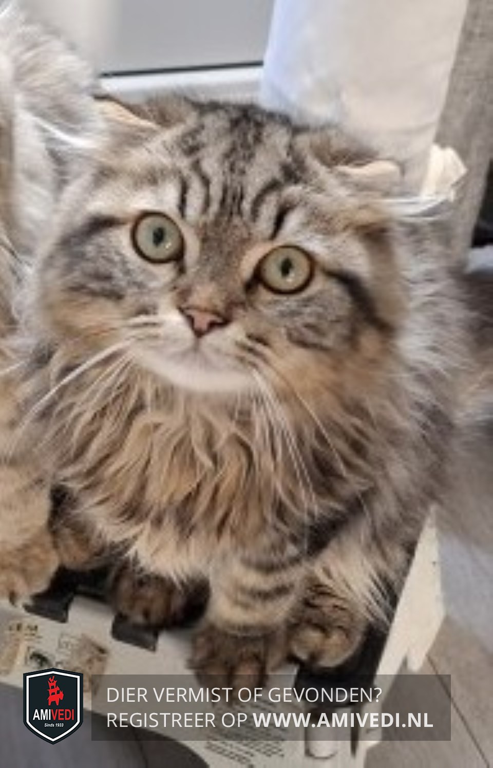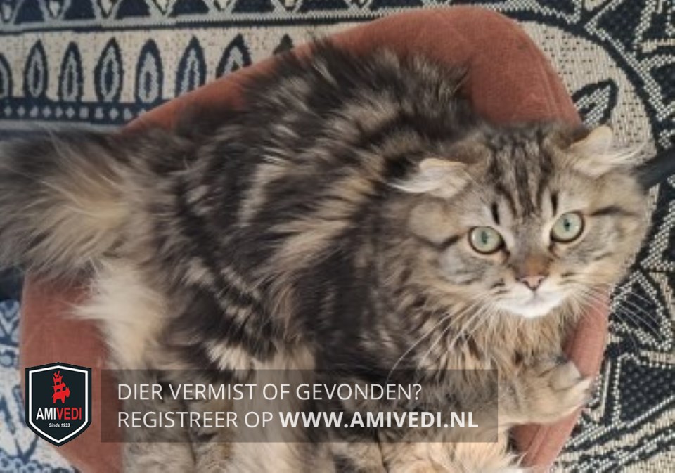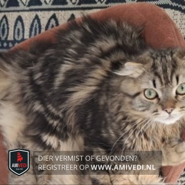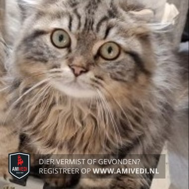 Signalement | Platte oortjes. Wit bij de snorharen en witte kin. Witte pluimpjes uit de oren. Verder beige-zwart gestreept met lange haren. Pluimstaart. |