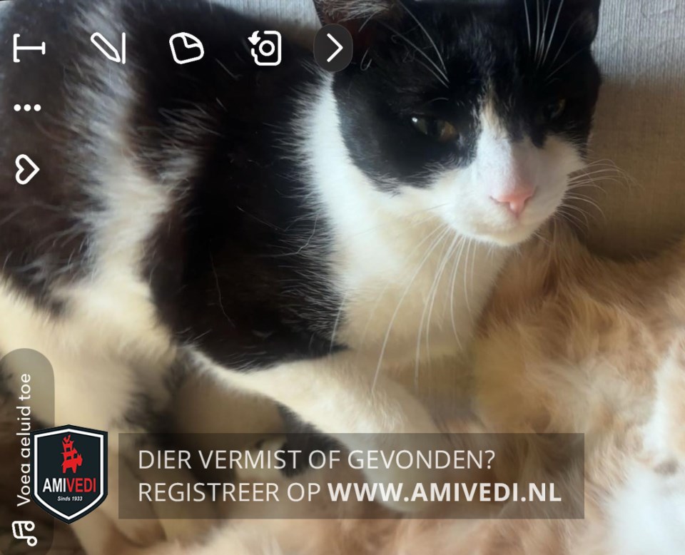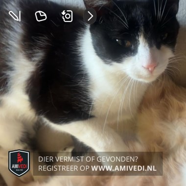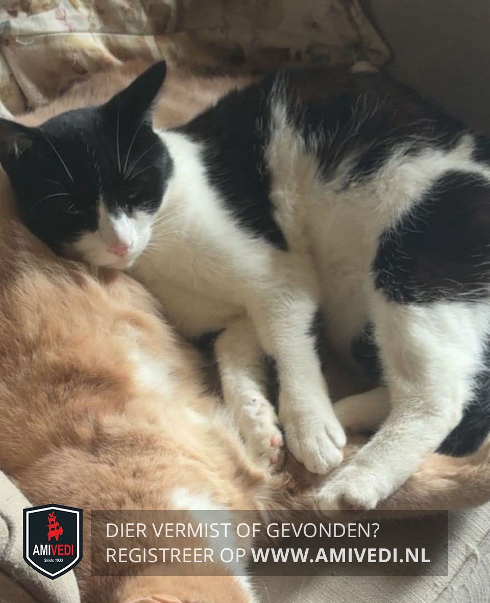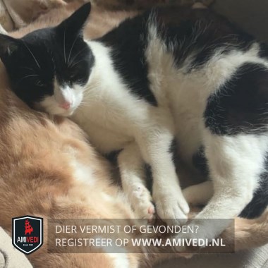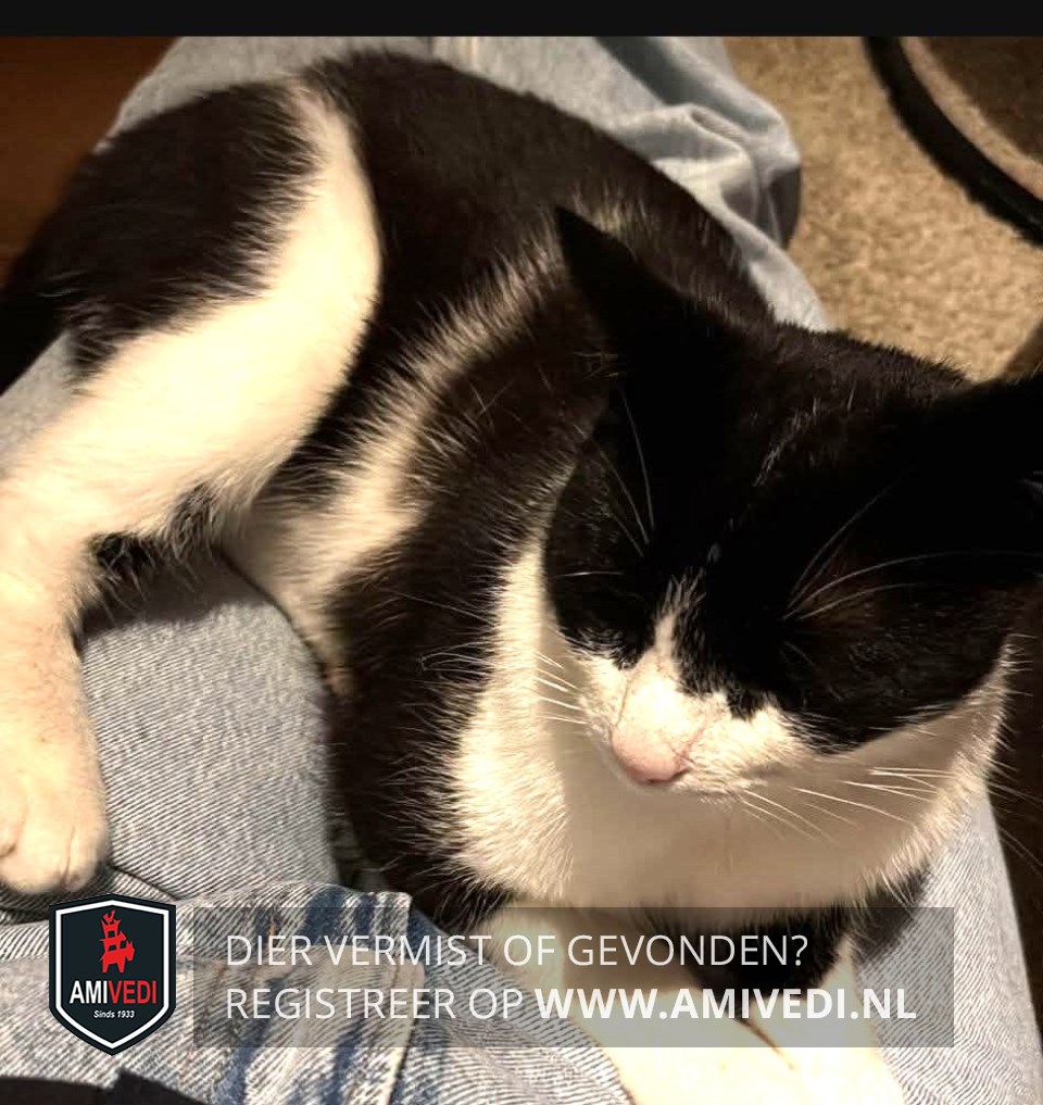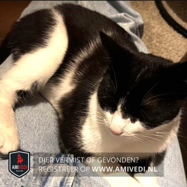 Signalement | Zwart met wit snoetje, een roze neusje witte borst, kraag, witte buik en witte poten en is klein en jong. |