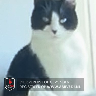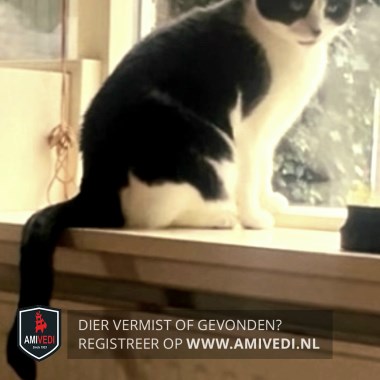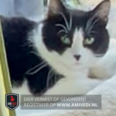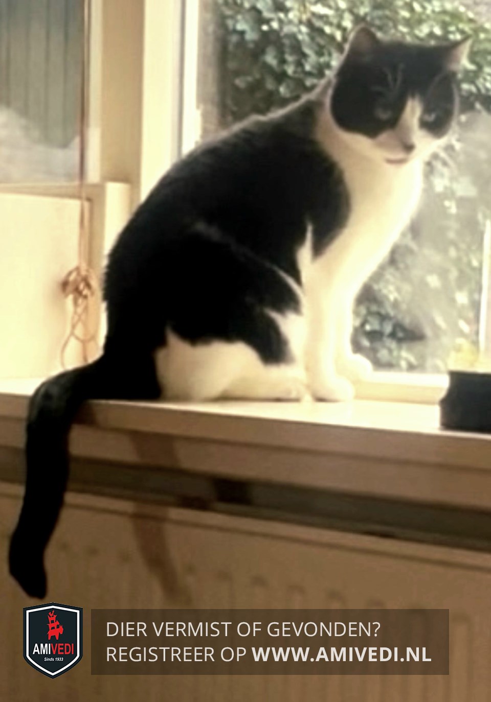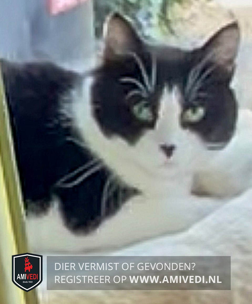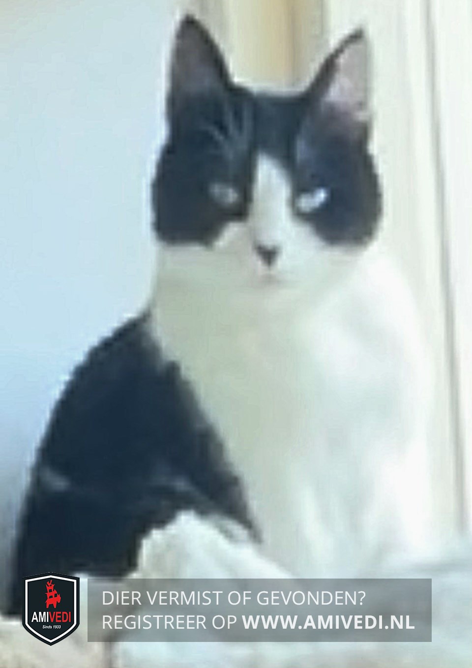 Signalement | Zwart witte poes. Bovenkant zwart, onderkant wit. Witte snuit met zwarte neuspunt. Witte borst, buik en poten. Zwart over ogen, oren, rug, flanken en staart. Op onbekend adres ontsnapt. |