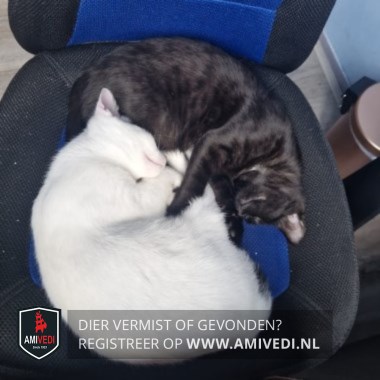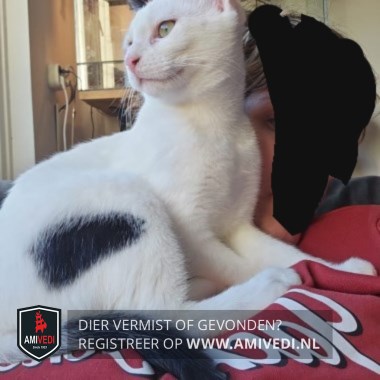 Signalement | Witte kater met linkerkant oor zwart, zwarte vlek op linker bil en zwarte staart. |