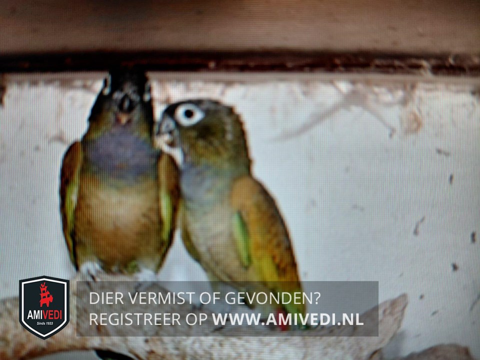Signalement | dwerg papagaai, Groenwantparkiet - Pyrrhura Molinae Grijze kop met een groen gele onderkleur, gele keel, oranje buik, oranje vleugels met groene uiteinde, rode staartveren. |