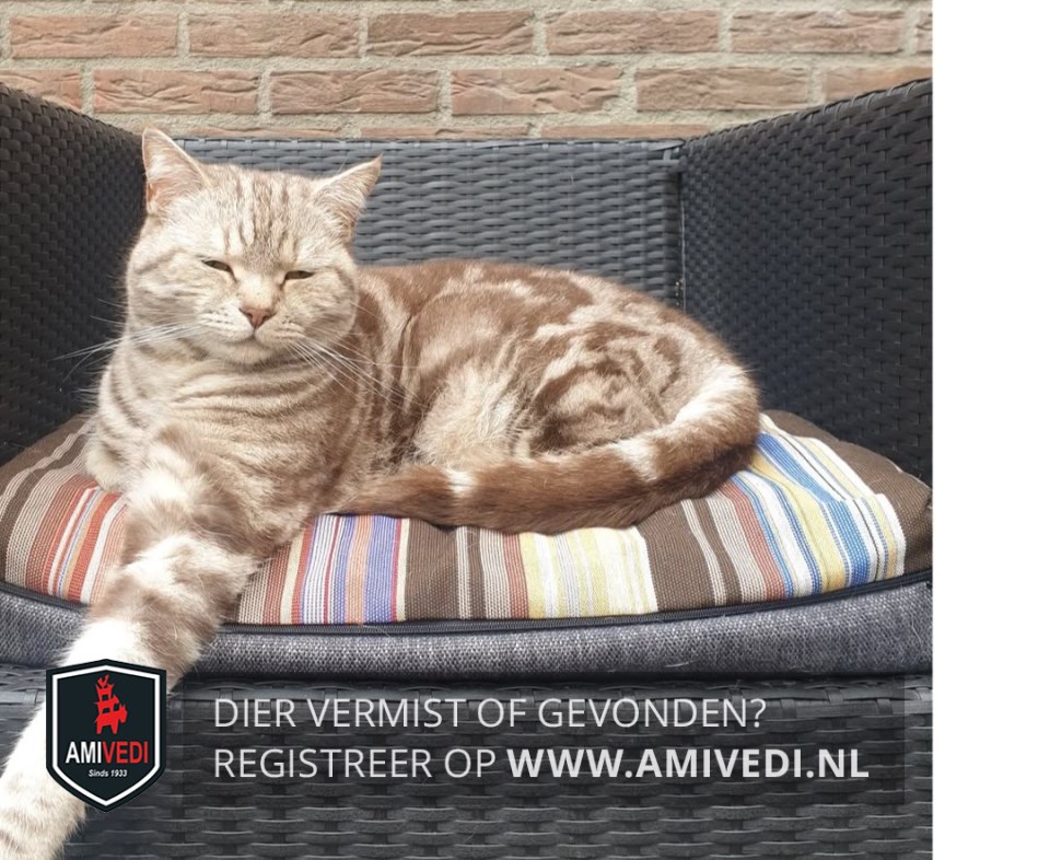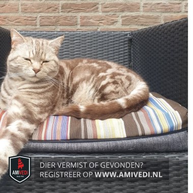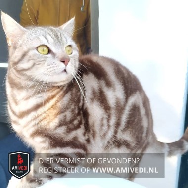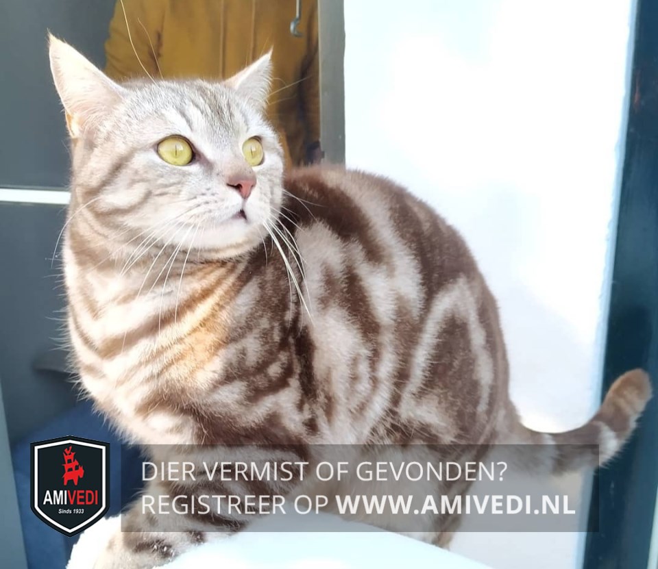 Signalement | Gemarmerde kat, bruine vlekken met beige onderkleur. Gele ogen. |