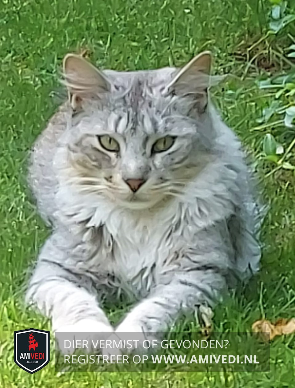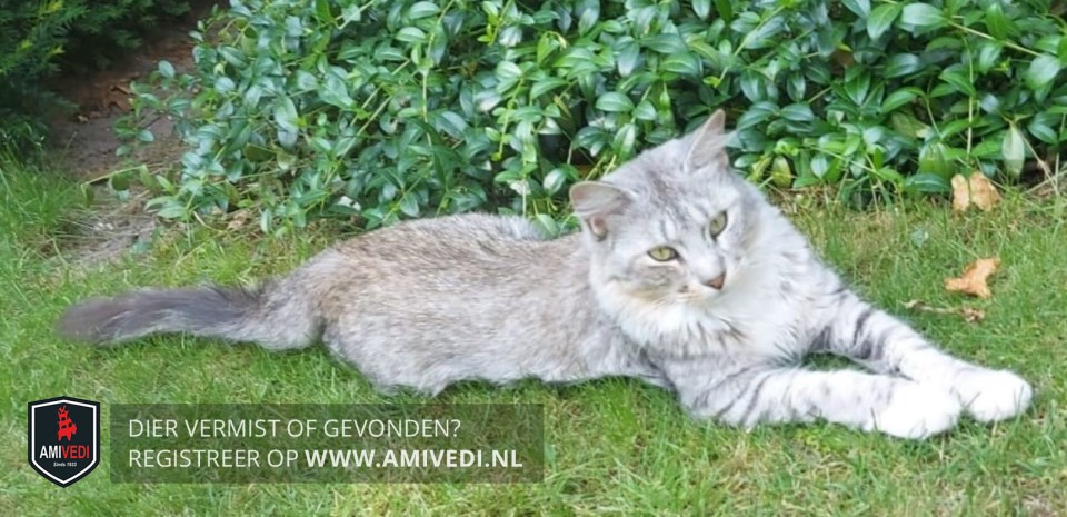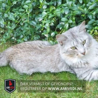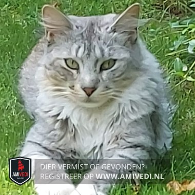 | Signalement | Halflangharige slanke poes, grijs/beige/wit cypers/gemêleerd en een pluimstaart. Grijs/groene ogen. |