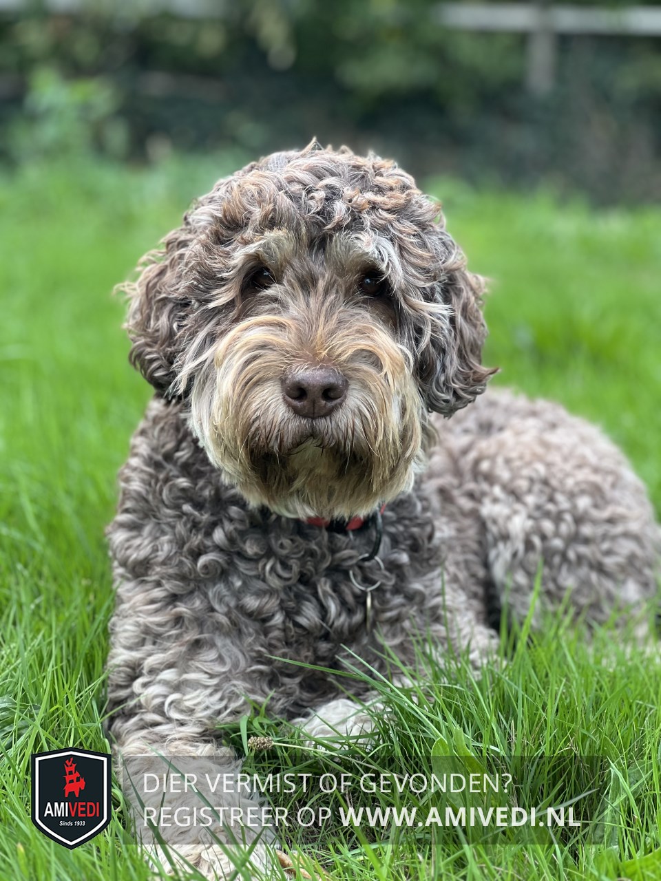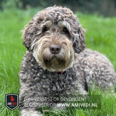 | Signalement | Grijs/bruin gemêleerde Labradoodle. Medium groot tot aan de knie. Angstig. Heeft een rode halsband met een penning om. Redelijk korte gekrulde vacht. |