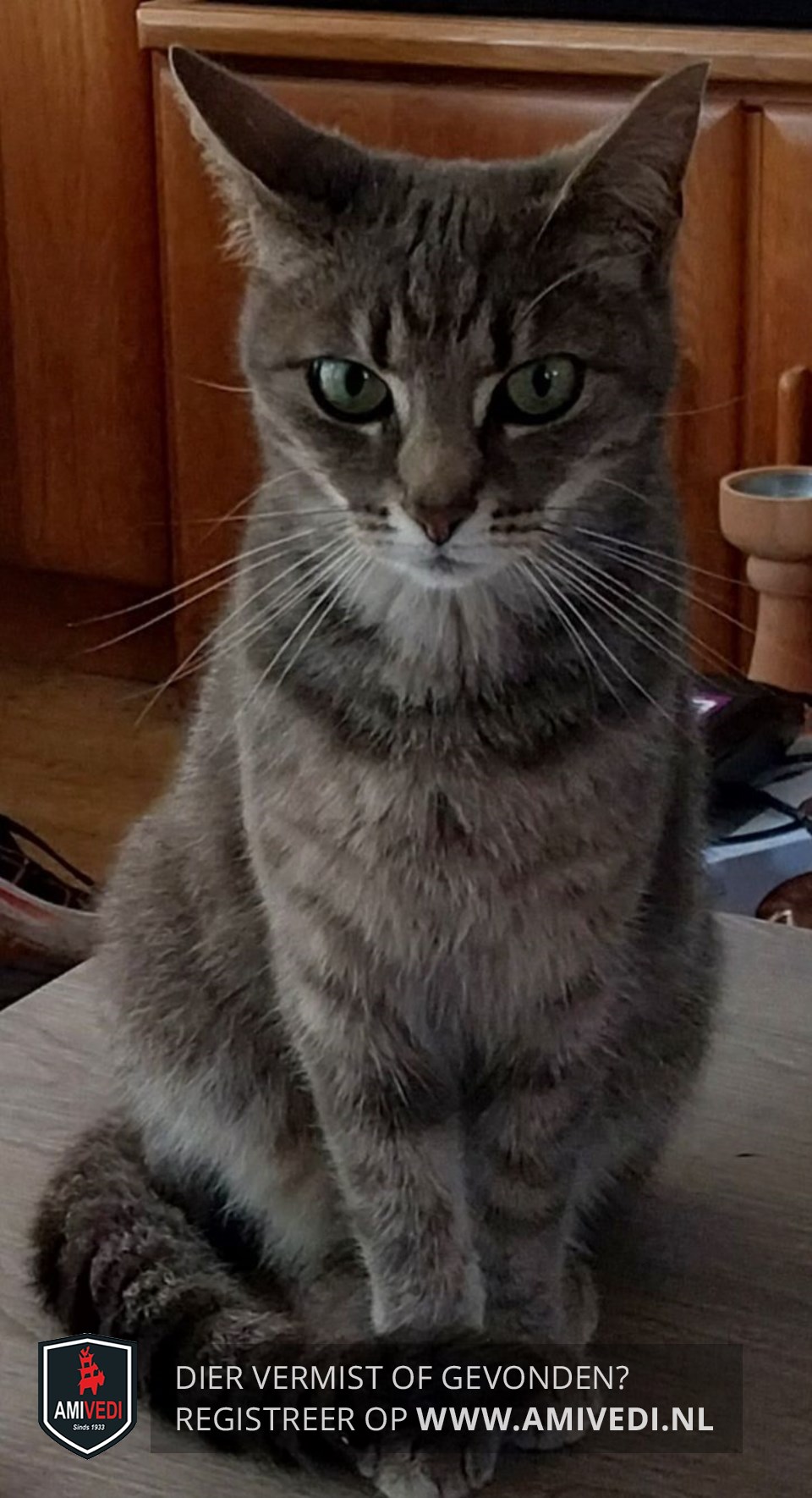 | Signalement | Geheel cypers bruin/zwart gestreept met een beetje wit rond de mond. |