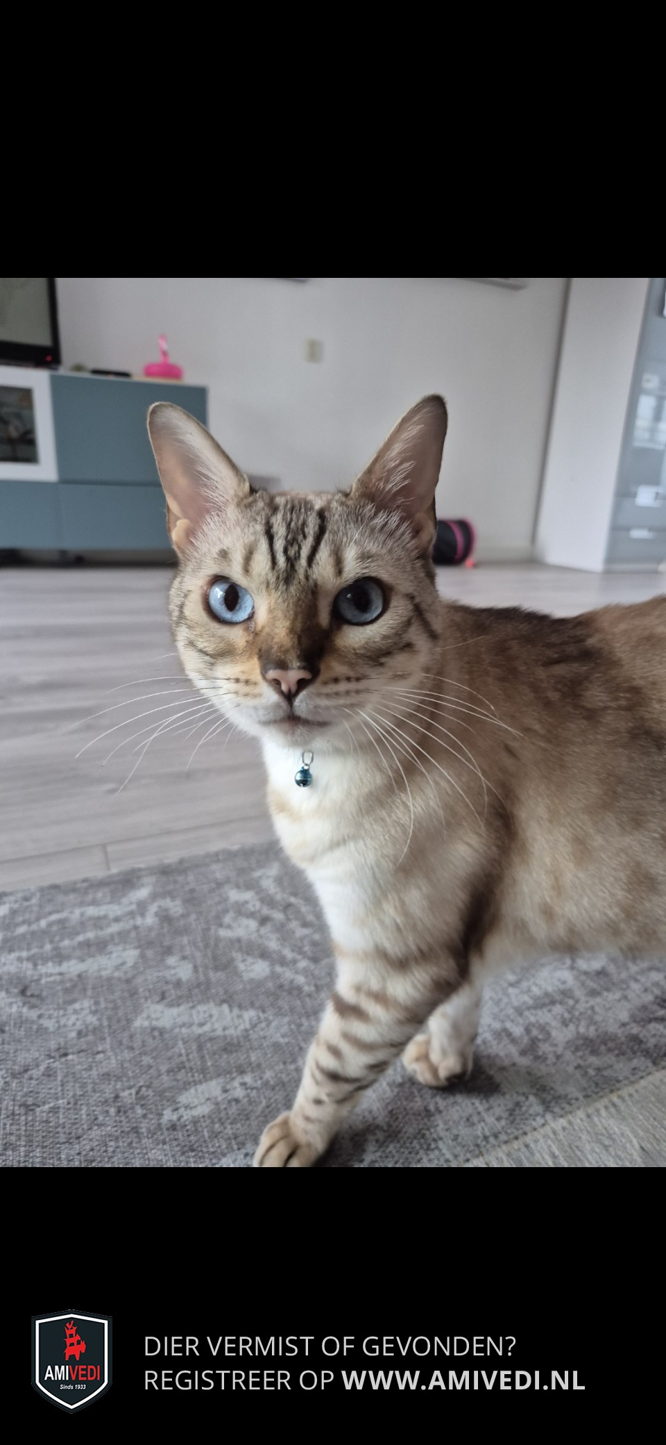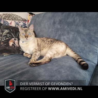 | Signalement | Kop beige, cyperse strepen op het voorhoofd en om de ogen, bruin op de neus, wit om de bek, blauwe ogen. Borst wit. Poten hebben donkerbruine/zwarte streepjes. Rug meer gevlekt dan gestreept. Staart zwart geringd. |
