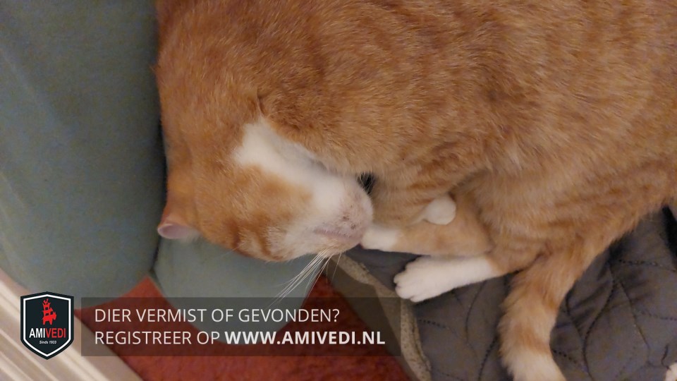 | Signalement | Cypers rood met wit gestreepte kater, witte snorharen, wit bekje, witte kin en bef, linker achterpoot wit sokje, rechter achterpoot wit voetje, linker voorpoot ook met wit, staart rood/oranje gestreept, met op het einde ook wit |
