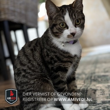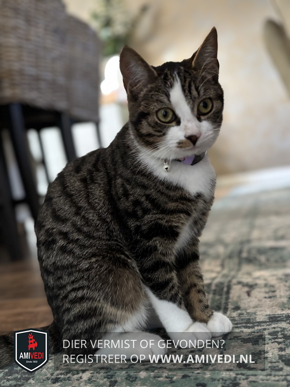 | Signalement | Grijs/ zwart gestreept met wit. Wit snoetje met links van neusje vlekje . Witte hals, bef, borst. Witte voetjes/ sokjes. Bij haar oogjes 2 zwarte vlekjes. Roze bandje met adres gegevens. |