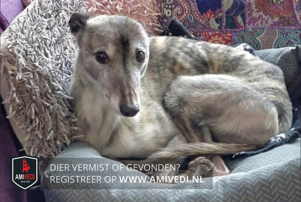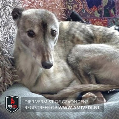 | Signalement | Bruin/beige-blond, gestroomd. Whippet windhond. Slanke hond. Graag rustig benaderen. |