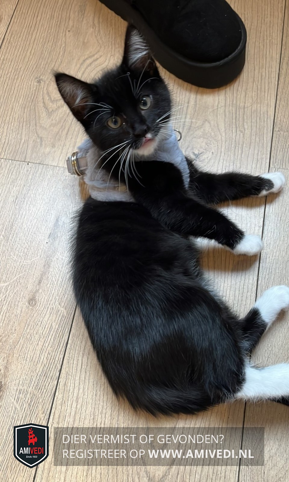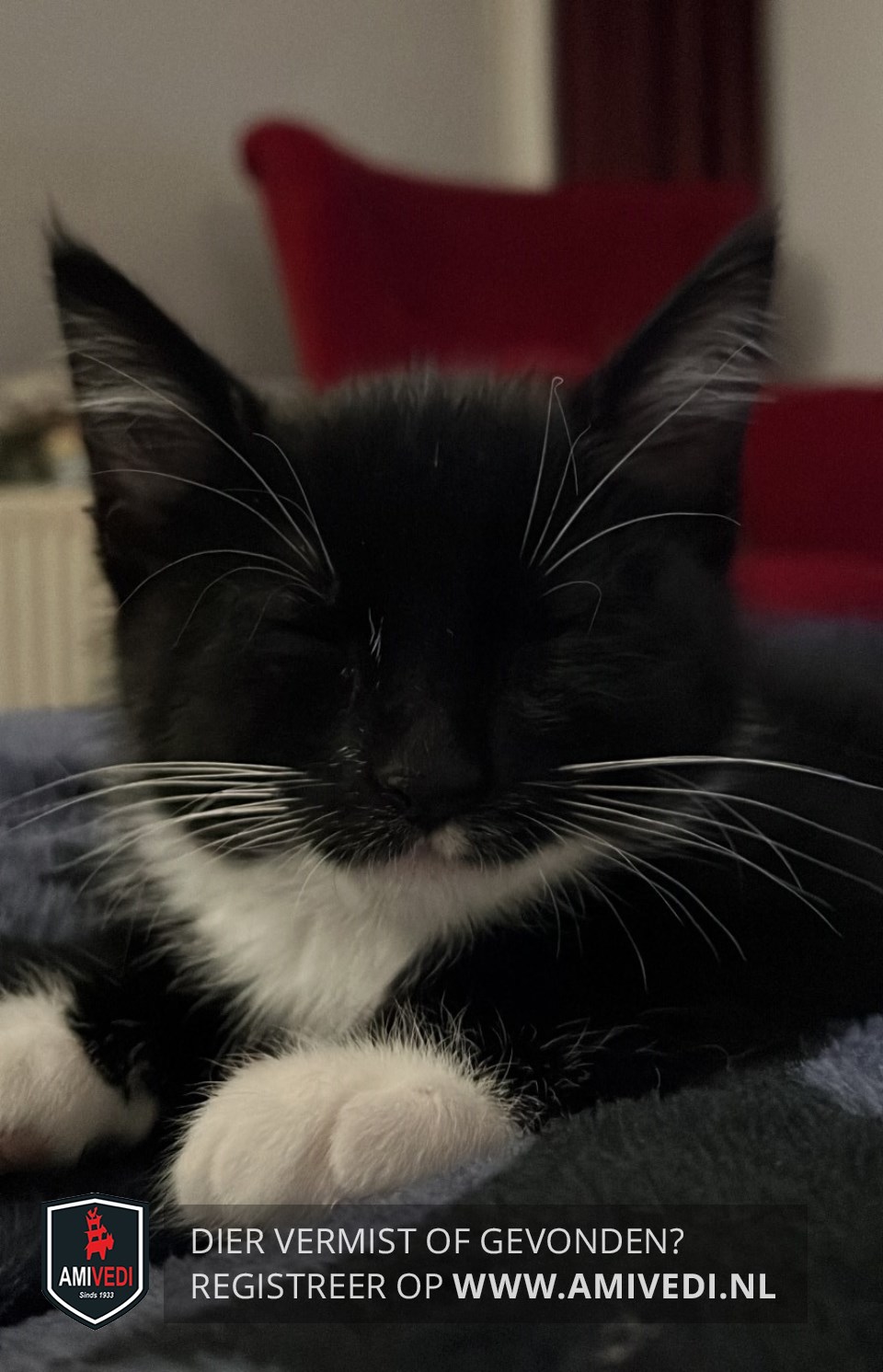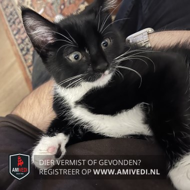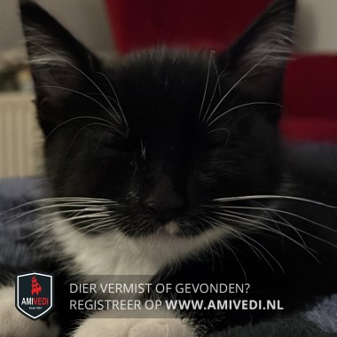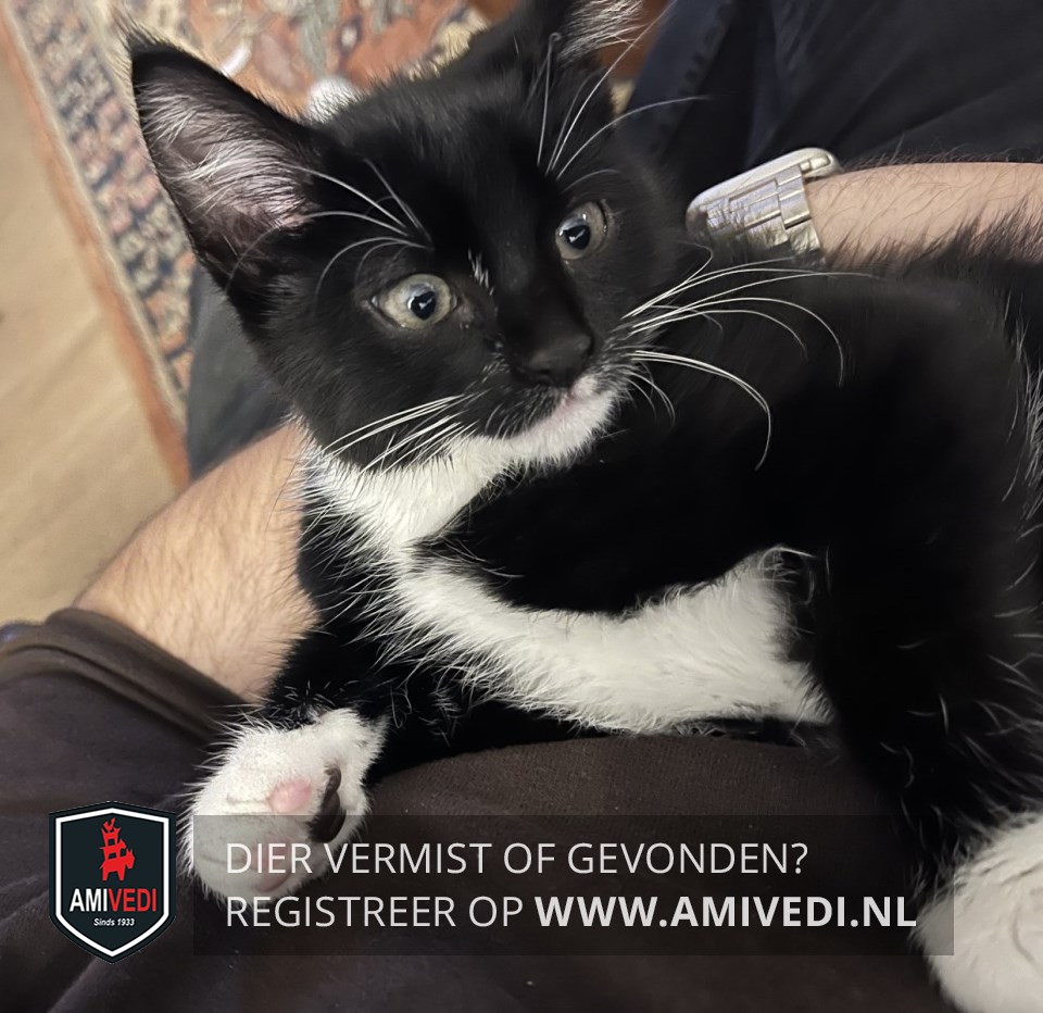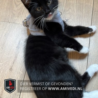 | Signalement | Zwart/wit katertje met lange witte snorharen. Wit vlekje op de linker bovenlip, witte kin, hals en bef dat doorloopt over de maag. Voorpootjes korte witte sokjes, rechter achterpootje een langer wit sokje, linker achterpootje witte kniekous. |